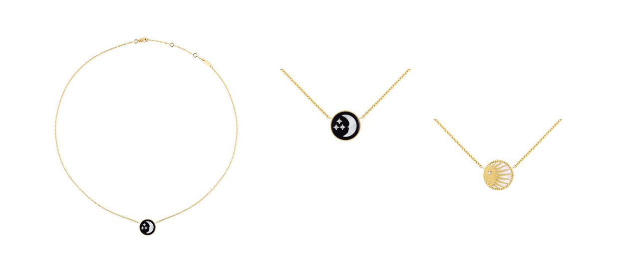 「ローズ デ ヴァン」コレクションから派生した「ローズ セレスト」。クチュリエが大切にしていた占星術やタロットのラッキー モチーフから象徴的な2つの天体、月と太陽をセレクトしたダブルフェイス仕様で、片面にはオニキスの夜空に星々が寄り添い微笑む月が、もう片面にはマザー オブ パールの空に太陽が輝く。