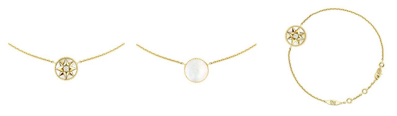 ムッシュ ディオールが幼少期を過ごしたグランヴィルの邸宅にみられた風配図に着想を得て生まれた「ローズ デ ヴァン」。 旅を想起させるデザインに配されたゴールドとダイヤモンドの星は、ディオールの最強のシンボルのひとつ。メゾンの豊かな歴史と物語が息づくメダリヨン。ツイストしたライスグレインで縁取られ、身につける人の動きに合わせてチェーンの先で反転して、ある時はストーンが、またある時にはローズ デ ヴァンが現れ表情を変える。