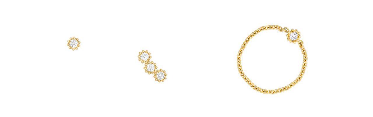 豊かさの象徴でもあるライスグレインと、プレシャスストーン使いが特徴的な「ミミローズ」。まさに小さなお守りのようにデザインされ、繊細なゴールドチェーンでかたちづくられるブレスレットやピアスには、悪運を払うといわれるダイヤモンド、エメラルド、ルビーストーンが上品にセッティングされている。主張しすぎることなく寄り添う華奢でセンシュアル、まるでレースのようにやさしく肌へ馴染む。