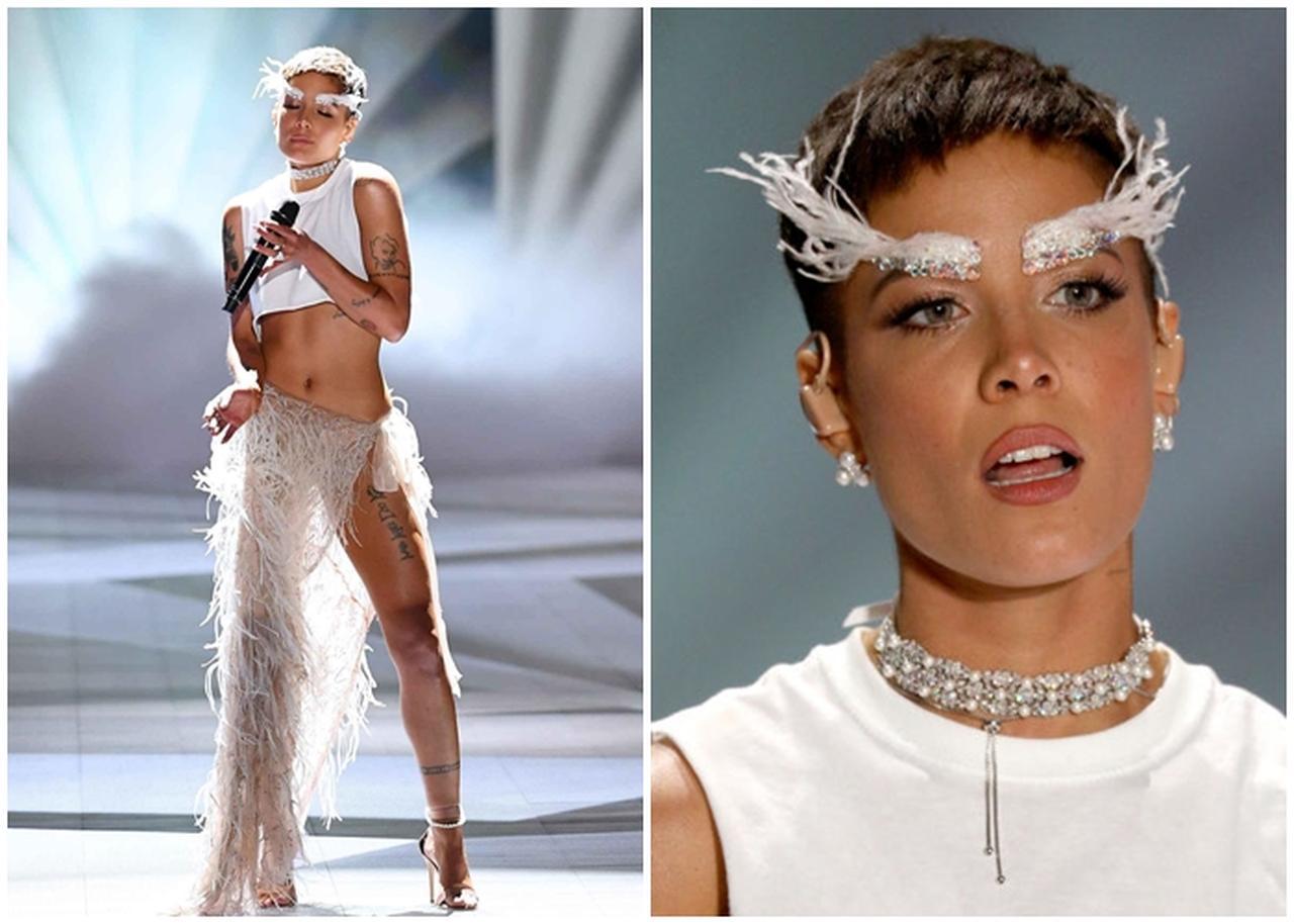 そんなセクションでパフォーマンスを行ったのが、シンガーのホールジー。彼女も白を基調とした衣装を身にまとい、美しい羽があしらわれたスカートを着用して登場。しかし、羽をあしらったのは衣装だけではなった。ホールジーが羽をあしらったのは、なんと眉毛。