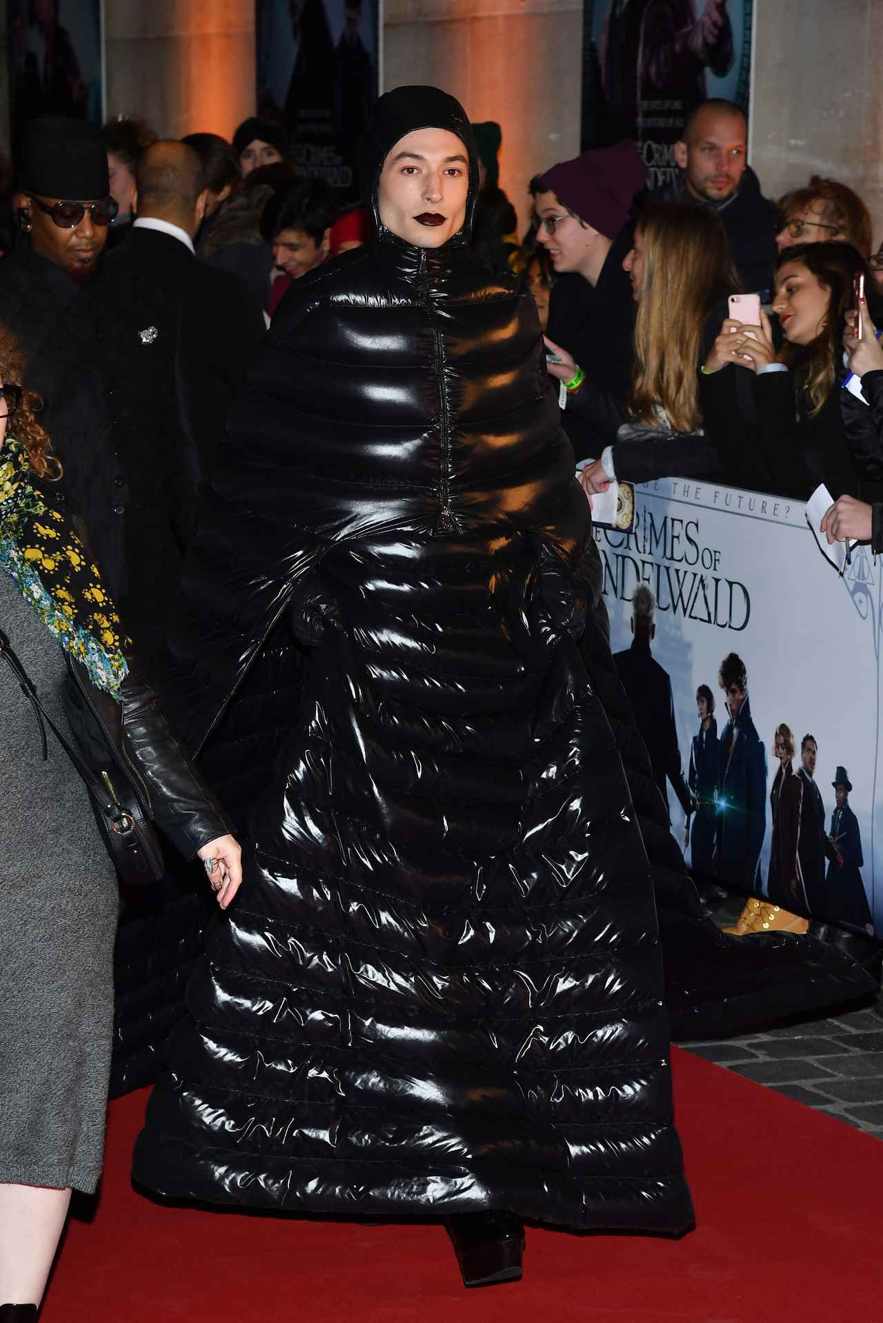 エズラはダウン素材のケープやロングドレスを身に纏い、さらにはダウン素材のグローブをはめ、顔だけが出ている状態でレッドカーペットに登場。そして唇にはダークリップを塗り、個性派のエズラならではのスタイルを披露。