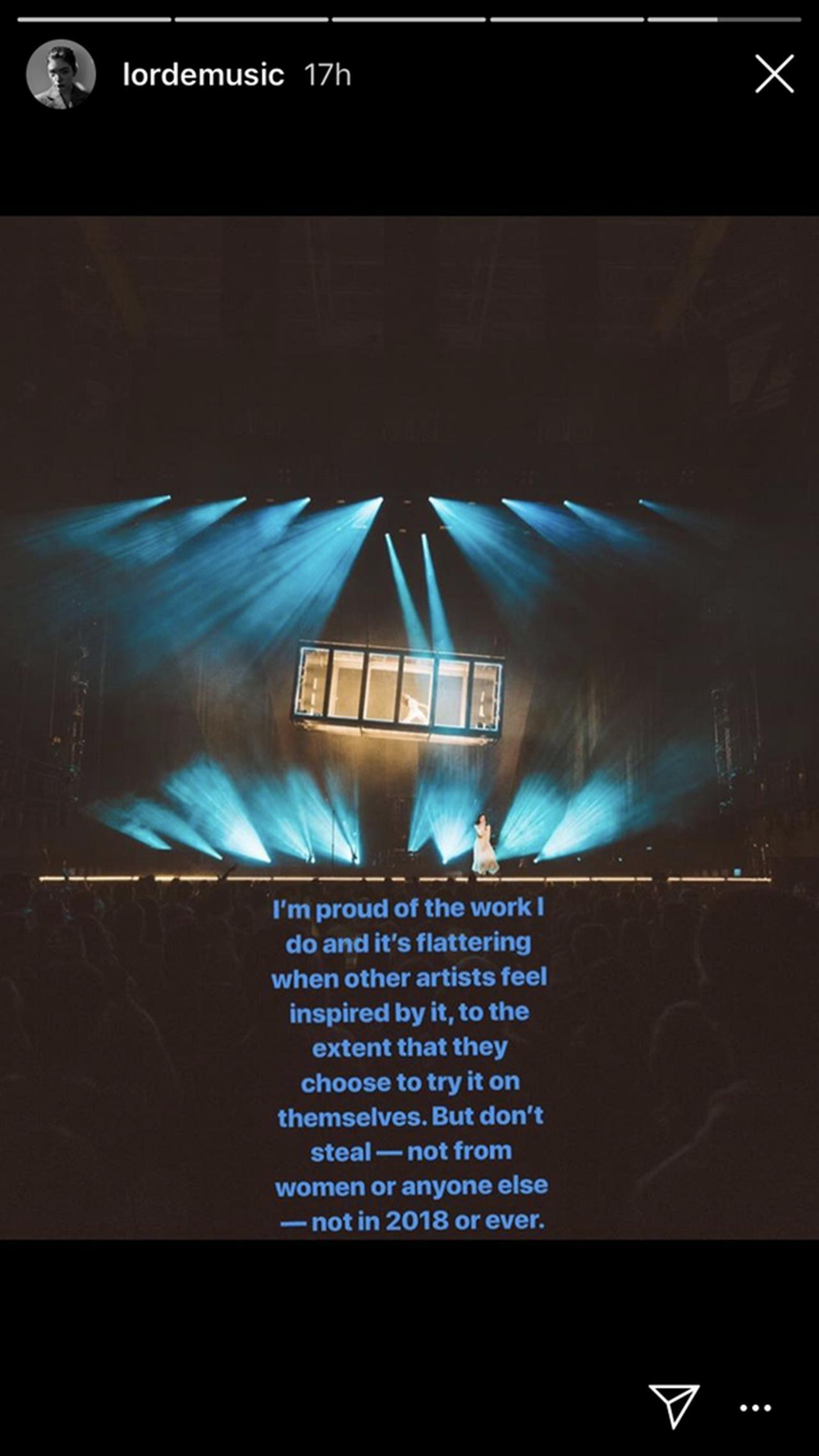 「自分の仕事に誇りを持っている。ほかのアーティストが自分の作ったものにインスパイアされて光栄だわ。しかもそれを彼らのものにしようとしているんだから。でも盗みはよくない。女性からでも誰からもダメだし、今の時代でもいつでもね」とコメントして、今回行われたカニエのステージ写真と、それに類似するロードが2017年に行ったコーチェラでのステージ写真を投稿した。