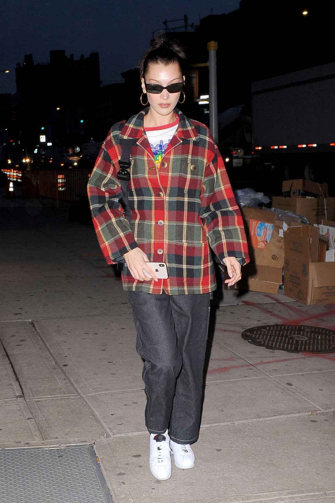 人気モデルのベラ・ハディッドは、カラフルなTシャツの上にチェックのオーバーサイズのジャケットを羽織り、ゆるラインのブラックデニムを合わせたポップ&カジュアルコーデ。