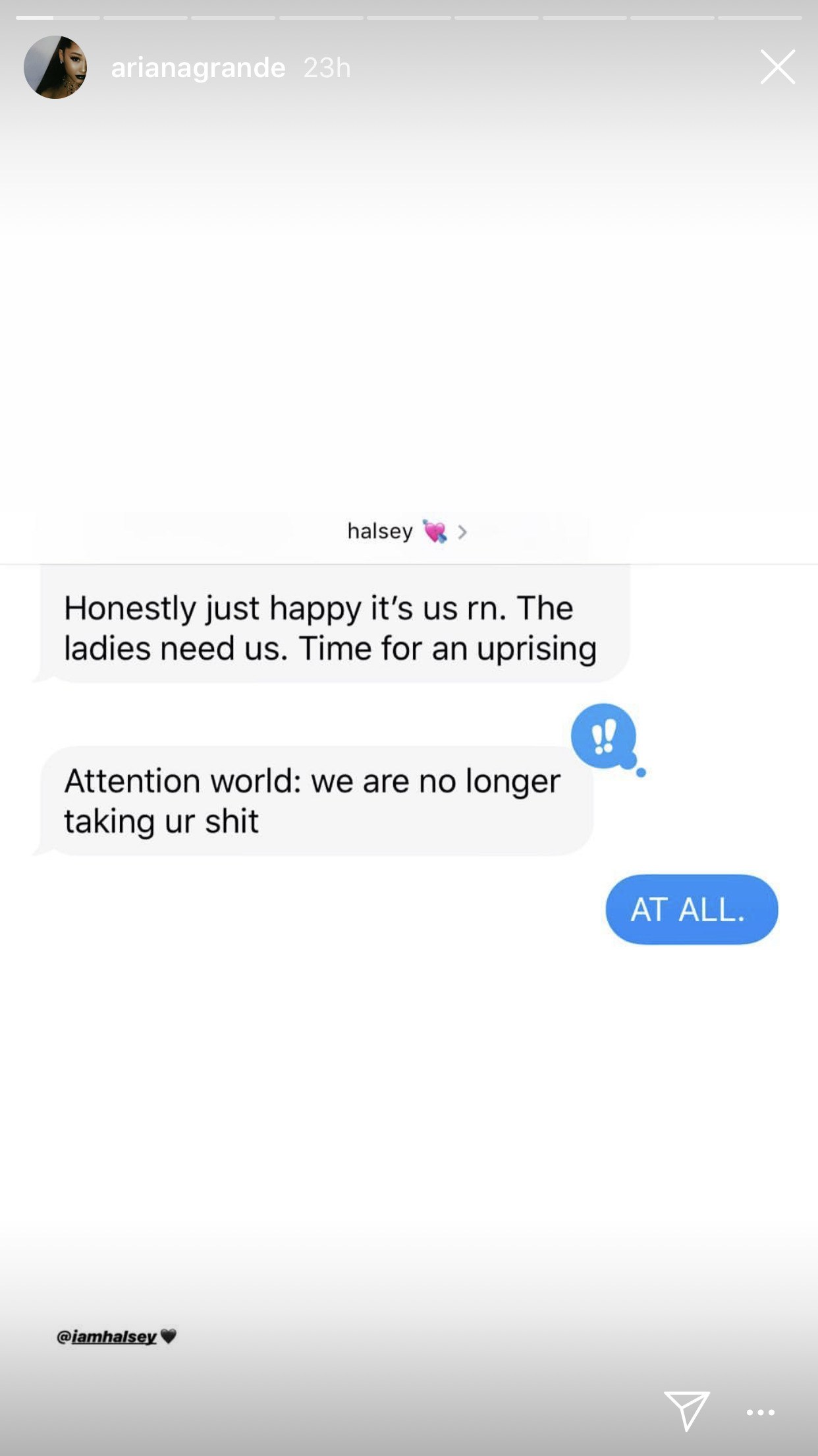 じつはピート・デヴィッドソンと10月に婚約破棄したアリアナと同様に、ホールジーも10月に恋人のGイージーと破局したばかりで、シングルライフを謳歌している。そのため今回のメールは女性同士の団結をみせた内容になっており、ホールジーが「実際今の私たちってハッピーよね。女の子たちが私たちを必要としているわ。反乱を起こすときよ」「みんなよく聞いて:私たちは、もうたわごとにつき合うつもりはないわ」とホールジーが送ると、アリアナはひと言「そうね」と返信。