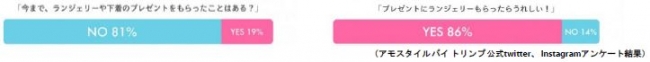 ランジェリーのプレゼントに関するアンケートを行ったところ、プレゼントにランジェリーをもらったことのある女性は19%という結果に対して、もらったら嬉しいとの回答は86%も!