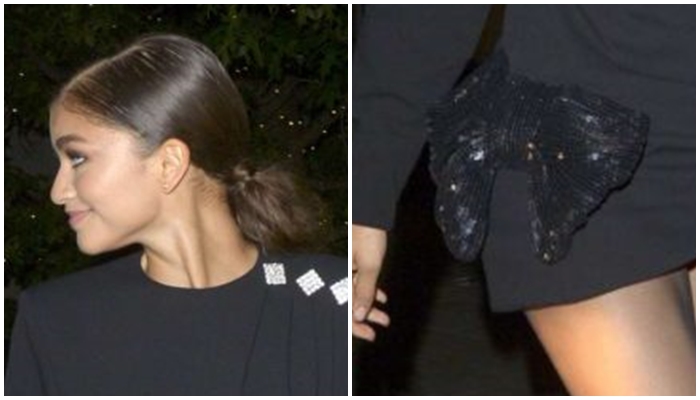 ゼンデイヤは、ボトム部分の両サイドにリボンがデザインされたロングスリーブのミニワンピースを着用。