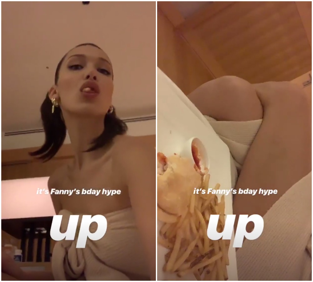 今年に入って3度目の来日を果たしたベラ・ハディッドが、宿泊先のホテルの自室で、裸にブラケットを巻いただけの無防備な服装で「ジャンクフード」を堪能する姿を撮影した動画を、インスタグラムのストーリーで公開。