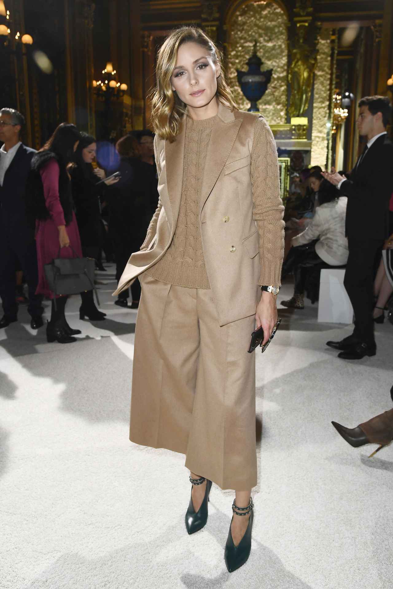 おしゃれな着こなしが人気のオリヴィア・パレルモは、ベージュのアイテムで優しい雰囲気のワントーンコーデ。