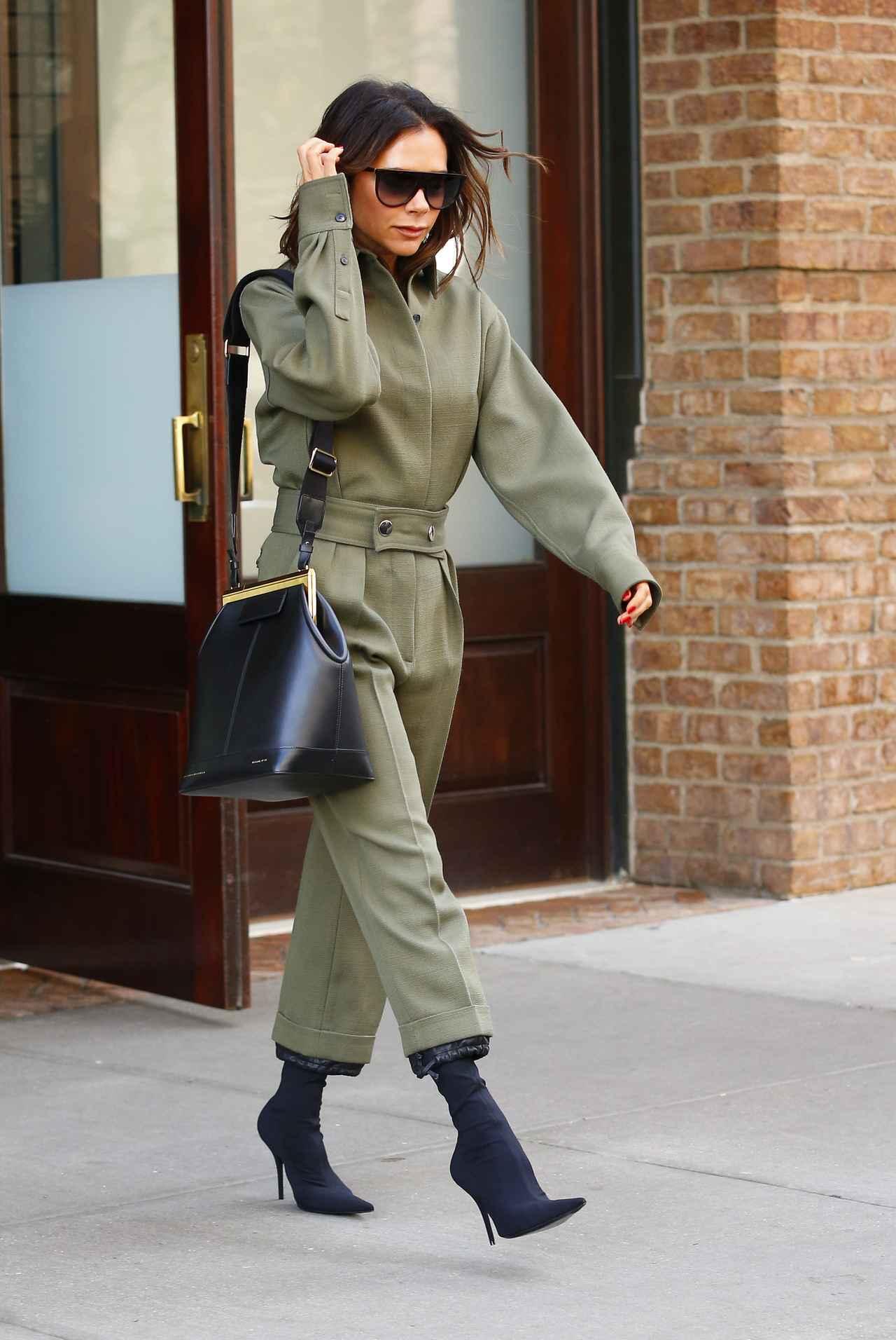 今年はパンツのワントーンカラーが旬! Victoria Beckhamのカーキのトップスにトラウザーをセットアップで着用して、かっちりとしたミリタリースタイルを作ったヴィクトリア・ベッカム。