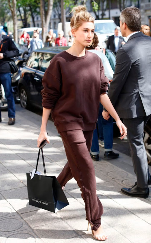 モデルのヘイリー・ボールドウィンは、ブラウンのスウェットに同系色のパンツを合わせたアーバンストリートなスタイル。