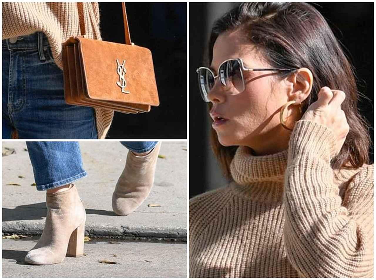 足元には、ベージュのショートブーツでニットとカラーをリンクさせ、キャメルブラウンのSaint Laurent(サンローラン)のショルダーバッグでニュアンスをプラスした、大人のリラックスコーデ。