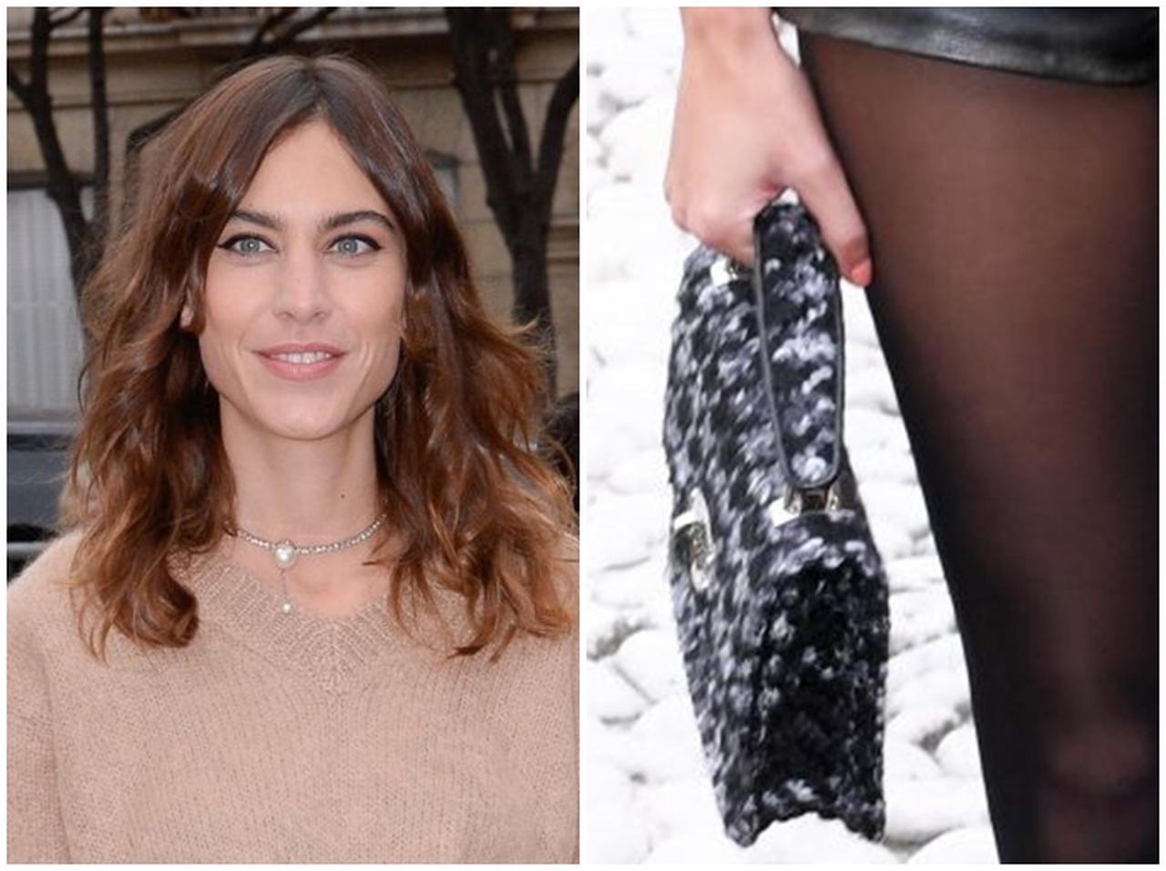 ニットの袖をたくしあげて肌を見せるテクニックで、すっきりと見える効果を狙ったアレクサ。ボトムには引き締め効果の高いブラックを選んで、シアーの黒ストッキングで美脚を強調して。
