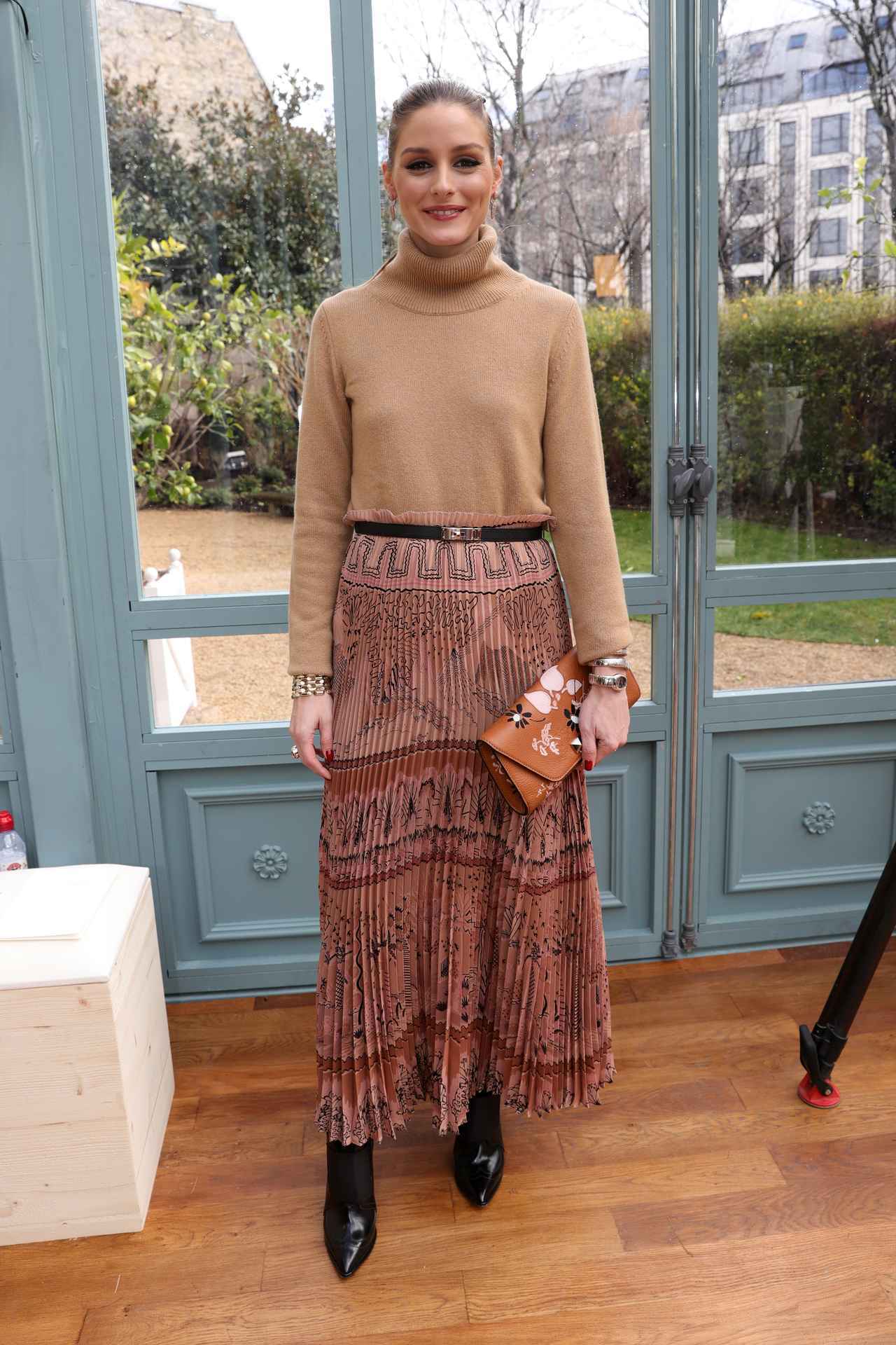 ベージュのハイネックニットをプリーツスカートにINしてすっきりとまとめた、人気セレブのオリヴィア・パレルモ。ブラウン系のスカートとバッグを合わせた、ウォーミーなカラーコーディネートに注目。