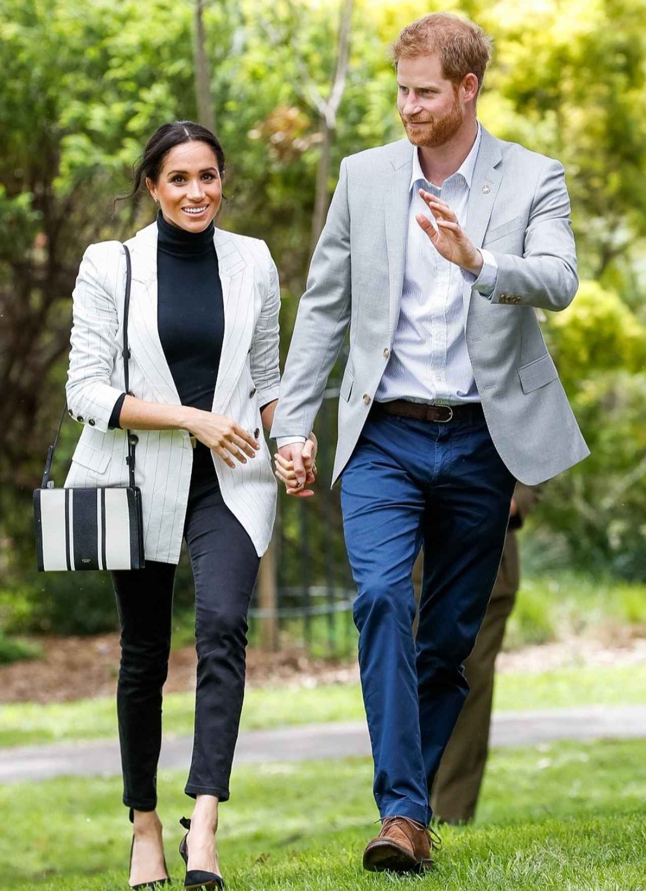 ファッションも注目度が高いイギリスのメーガン妃は、タートルネックにブラックデニムを合わせたシンプルなスタイルに、ホワイトストライプのジャケットを羽織ってキレイめに仕上げて。