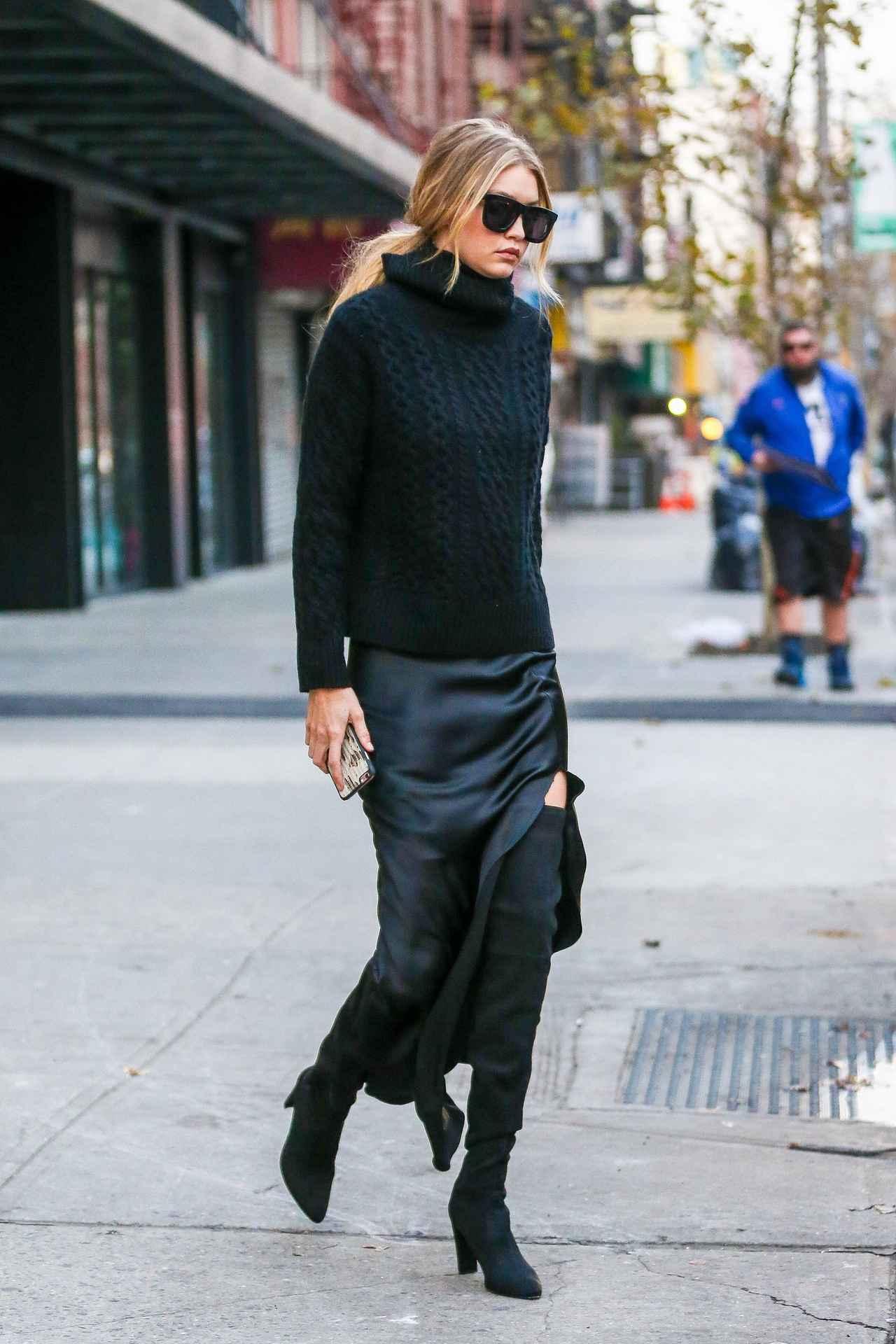旬な着こなしに定評があるトップモデルのジジ・ハディッドは、シンプルな黒のタートルネックに、スリットがセクシーなスカートを合わせた旬なオールブラックコーデ。