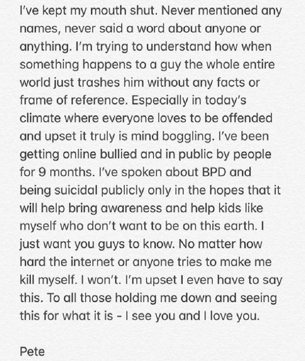 2017年に公表した境界性パーソナリティ障害についても触れたコメントからは、ピートがついに度重なる中傷に耐えきれなくなり、絞り出すようにして自分の心中を吐露した様子が伝わってくる。文章の終盤には“いじめには屈しない”という、顔の見えない加害者たちへの“挑戦状”ともとれる言葉も含まれていた。