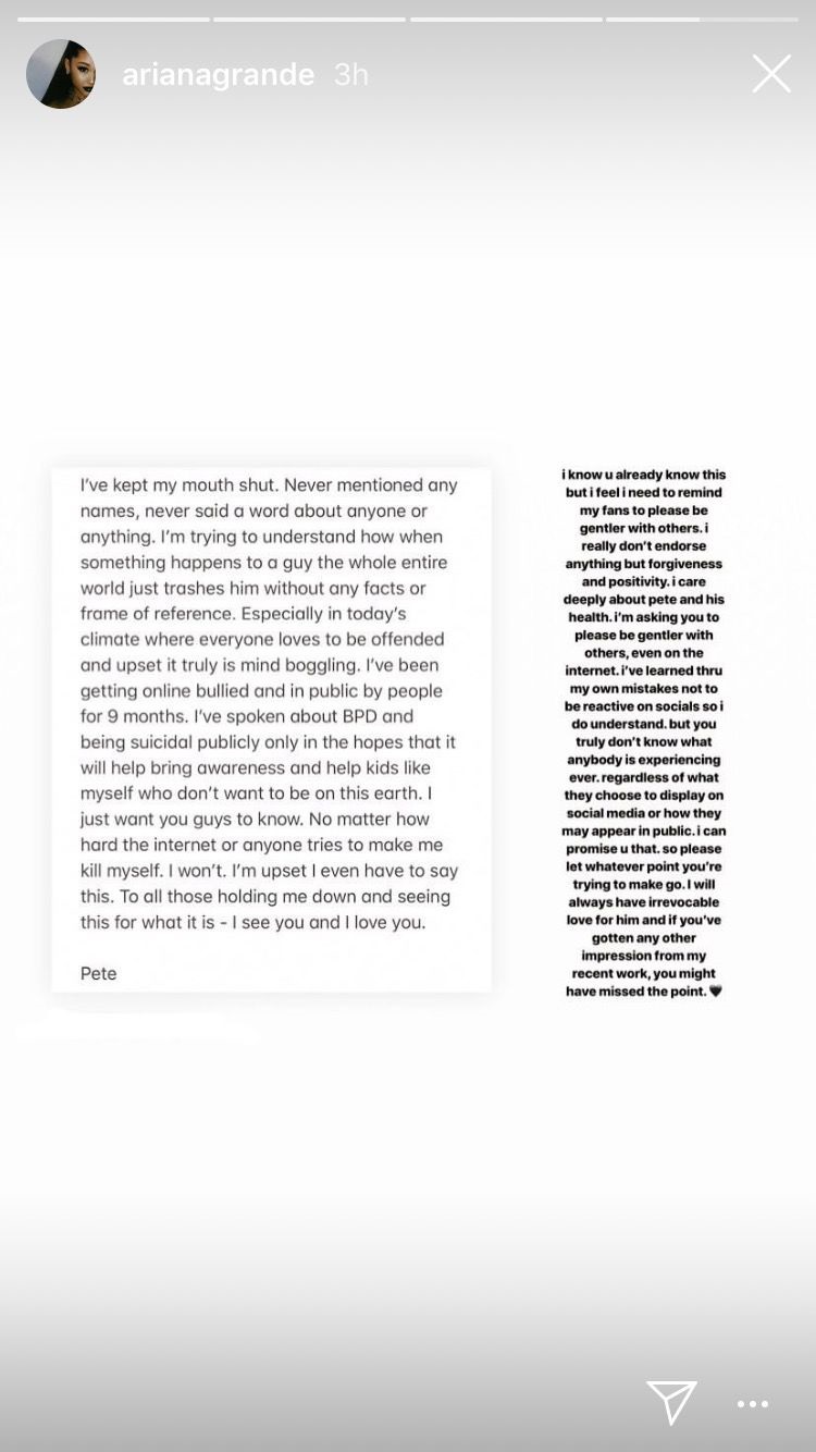 アリアナがシェアしたのは、ピートが前日に公開した、アリアナとの交際が発覚して以来、現在に至るまで何カ月にもわたってネット上で誹謗中傷の的となり、苦しんできたことを明かした投稿。