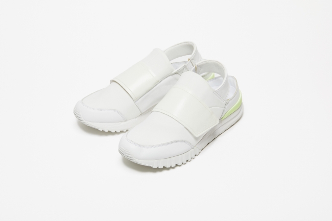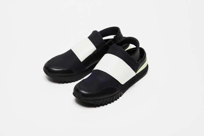 ANREALAGE 2018SSのパリコレクションのテーマ「POWER」を表現するエッセンスを取り入れ、アッパー(甲被)のベルト部分には屈曲や伸縮などの外部から加えられた力によるエネルギーを、光として放出する性質を持つ特殊材料「応力発光材」を採用。