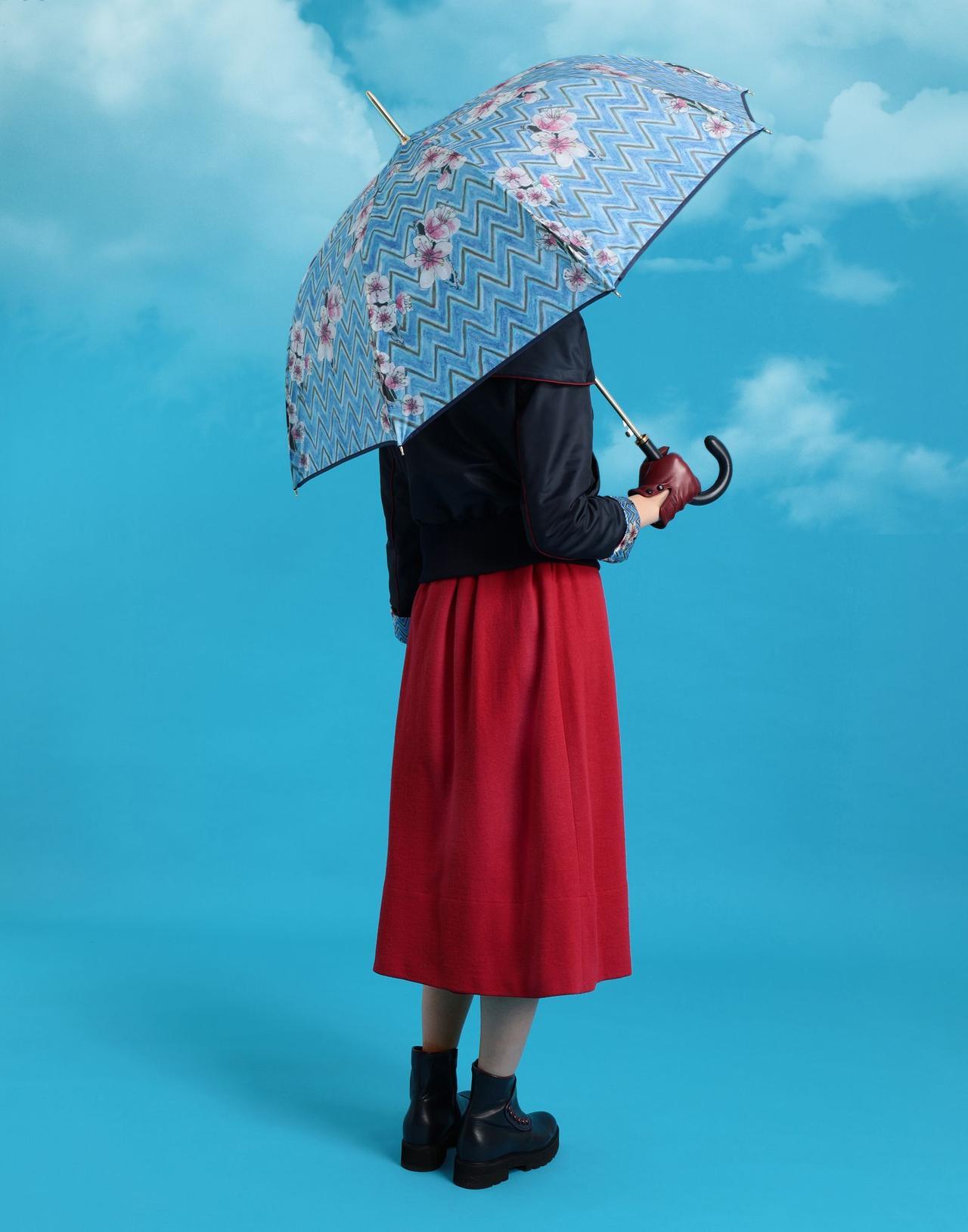 バーガンディーとライトブルーのカラーパレットに広がるフローラルのジグザグプリントにより、映画のシーンを印象づける満開の桜が表現されている。