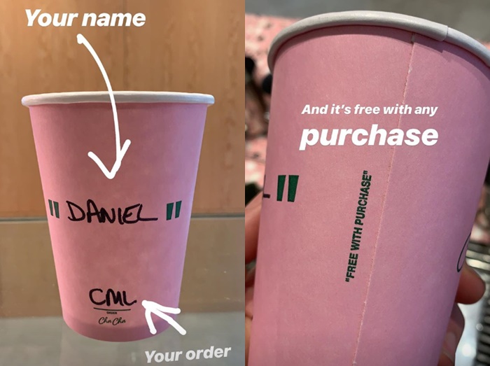 そしてカップは、カフェのカラーであるピンクをチョイス。中央には、ヴァージルらしくクォーテーションマークで名前を書き入れられるようになっており、カップのつなぎ目部分には、小さく縦にこれまたクォーテーションマークで「“FREE WITH PURCHASE”(※購入すると無料でついてくるという意味)」という文字が記されている。
