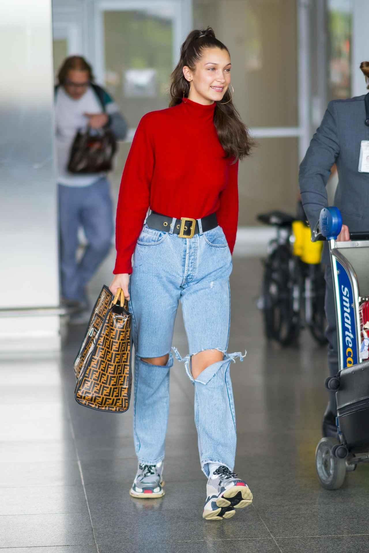 トップモデルのベラ・ハディッドは、ダメージデニムに赤のタートルネックをINして、太めのベルトのウエストマークとハイテクスニーカーを投入。ヘアスタイルもハイテールで、レトロミックスなストリートスタイルを作って。