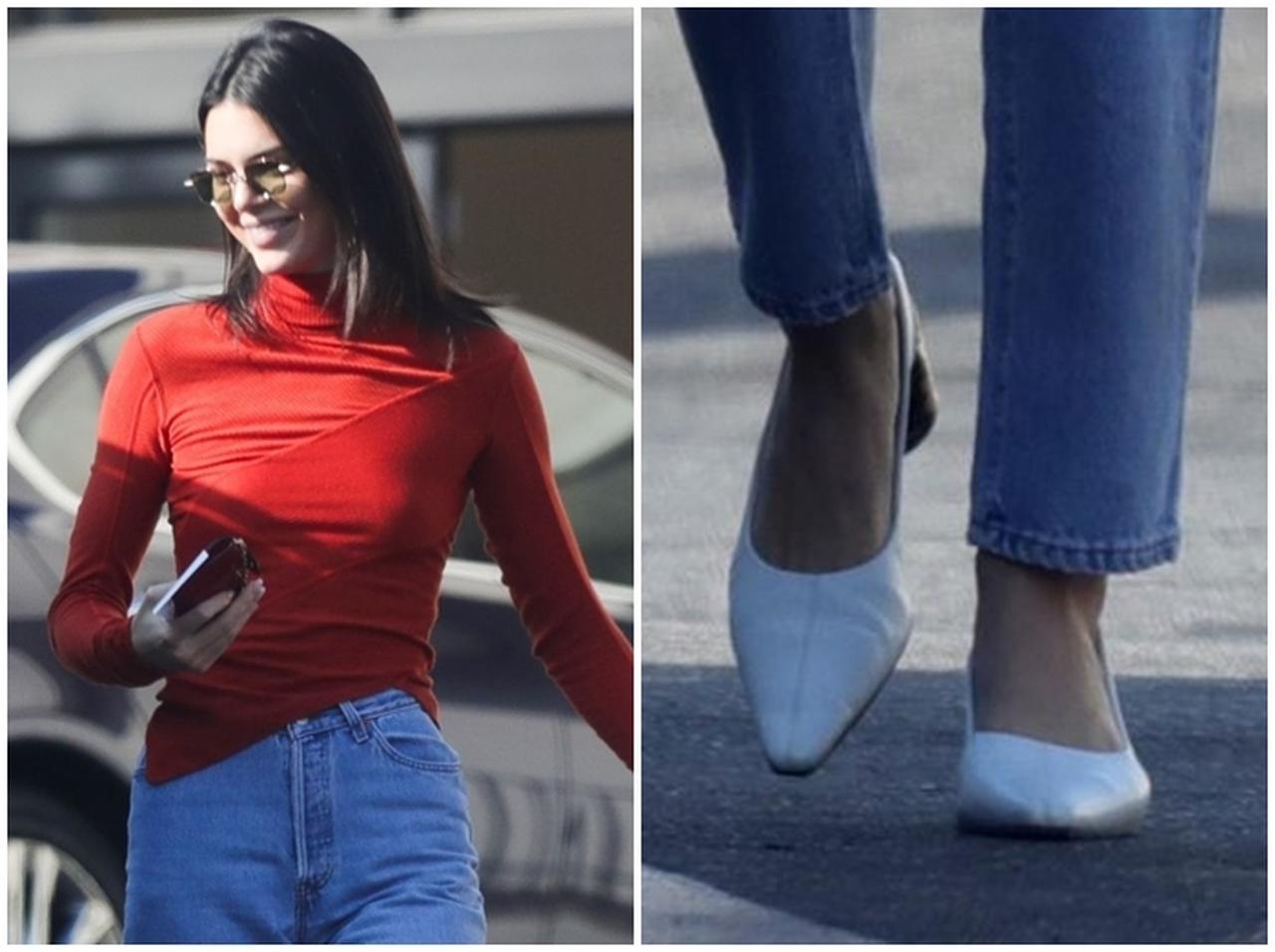 トップモデルのケンダル・ジェンナーは、赤のタートルネックに、トレンドのゆるめラインのデニムを合わせた洗練カジュアルコーデ。