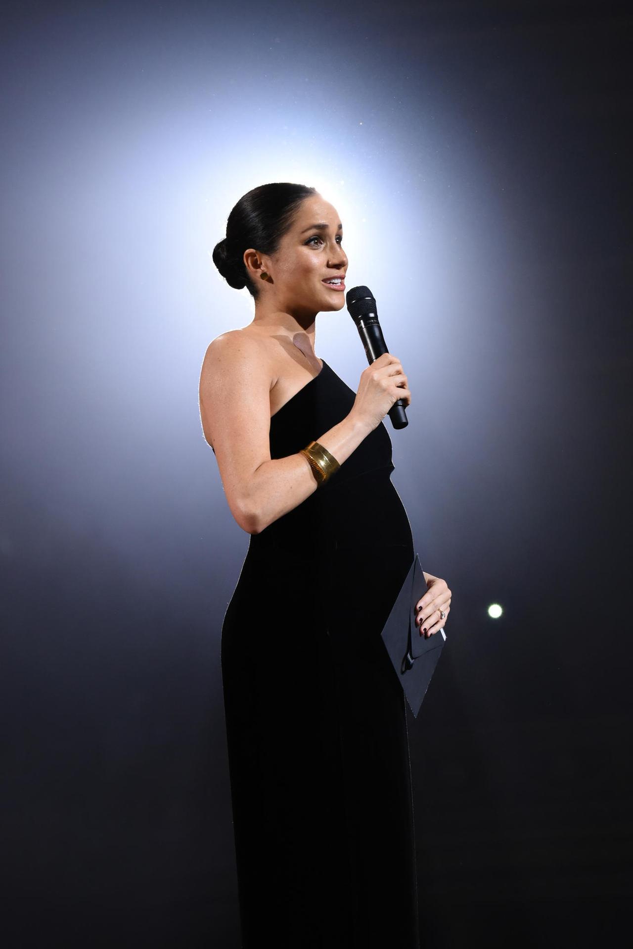 メーガン妃、「ワンショルダー」の黒ドレスで妊娠中のぽっこりお腹を露わに