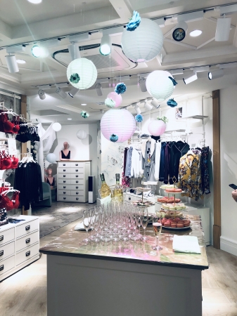 サラ・ジェシカ・パーカーのキャンペーンが飾られたショップのエントランスを入ると、正面奥の壁一面にSS19コレクションが飾られ、ボタニカルプリントやパステルカラーのアイテム、ジオメトリックなレースのランジェリーなどが登場し、そこは春のような陽気で爽やかな雰囲気に。