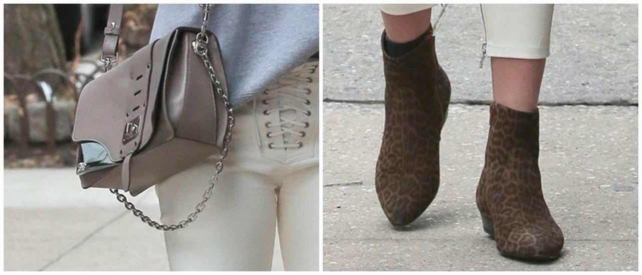 この日のバッグは、グレージュのショルダーバッグをチョイス。グレーとベージュの中間色のグレージュは、ホワイトなどのライトカラーと好相性! 仕上げのブーツはブラックを選ばず、ブラウンのショートブーツで、足元までソフトな雰囲気に仕上げて。