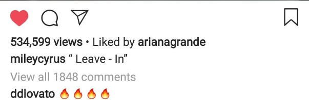 残念ながらこの投稿はマイリーによってインスタグラムから削除されてしまったものの、この投稿にはアリアナ・グランデも「いいね」を押して反応していた。(フロントロウ編集部)