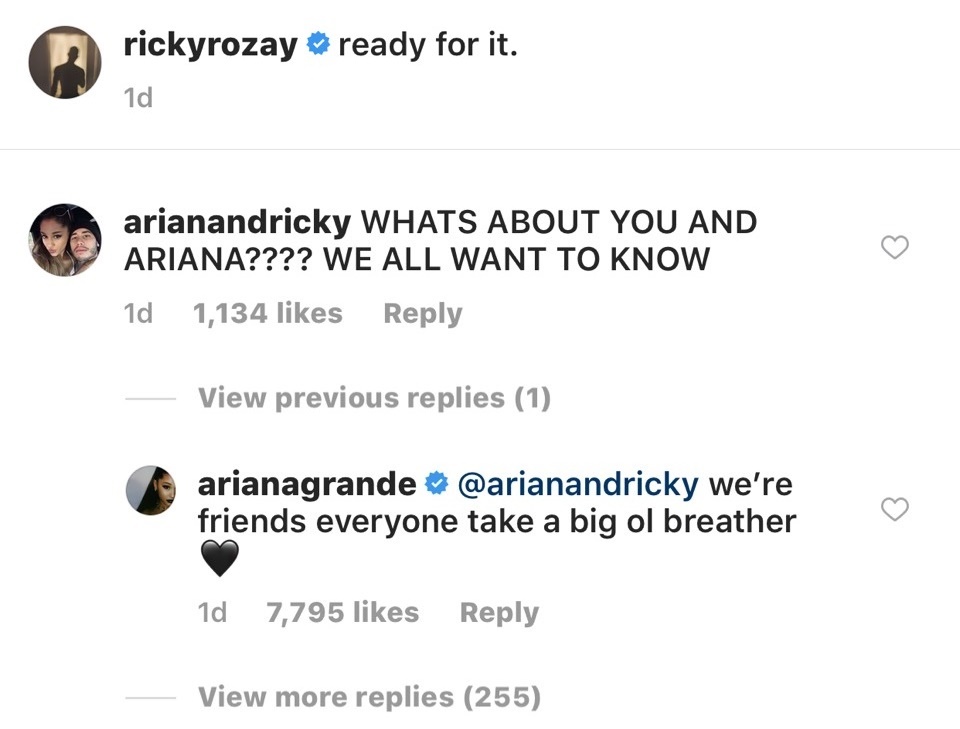 そんな2人の関係が再びヒートアップしたと言われる理由は、アリアナがリッキーのインスタグラムにコメントしたことから。