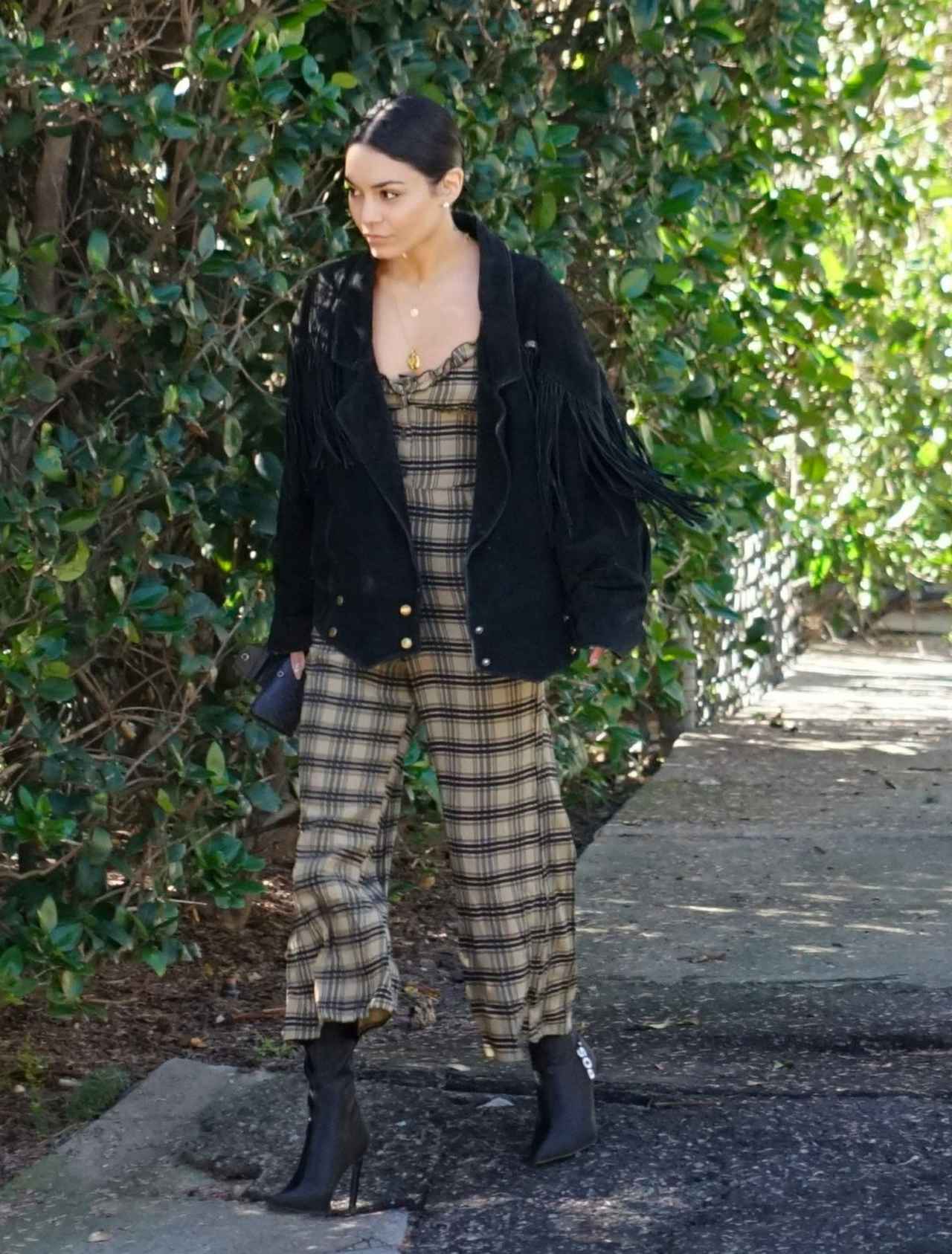 Faithfull the Brandのジャンプスーツの上から、ブラックのベロアジャケットを羽織ったスタイルに、Zara(ザラ)の「Post Love Pre」とプリントされたポップなショートブーツでアクセントを効かせたヴァネッサ・ハジェンズ