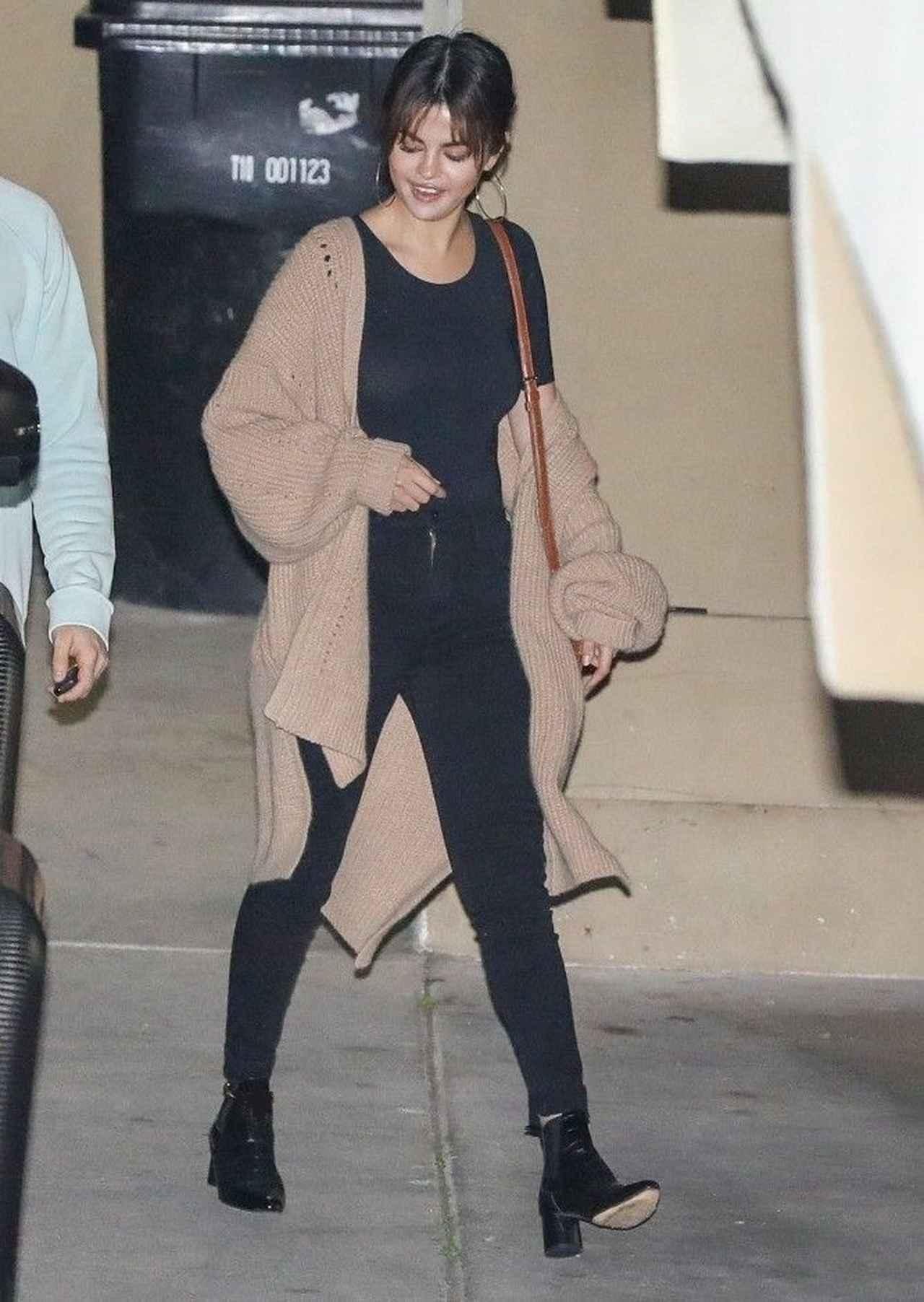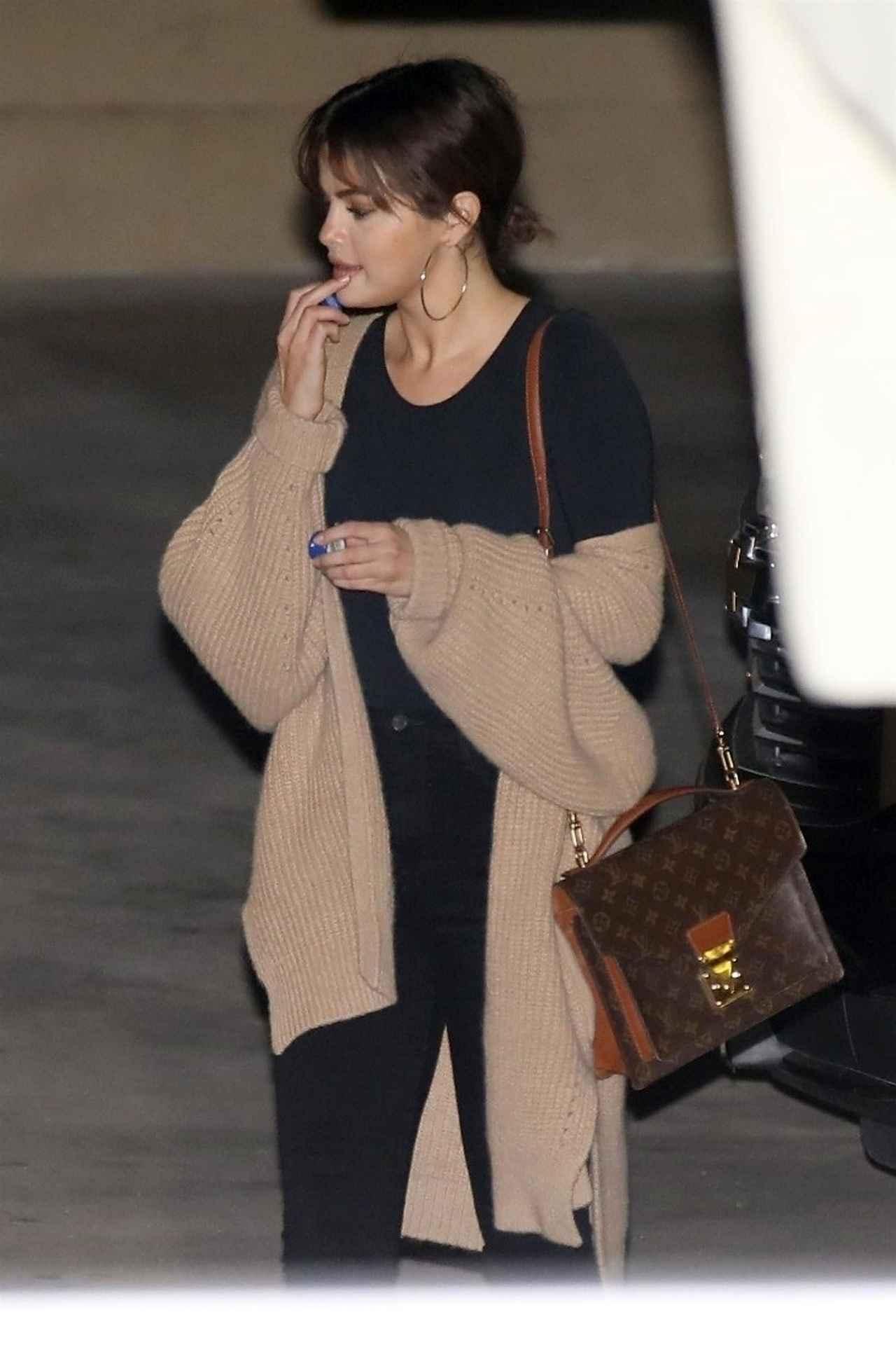 シンプルなブラックのTシャツにJ Brandのブラックスキニーを合わせ、オーバーサイズのニットカーデをざっくりと羽織ったセレーナ・ゴメス