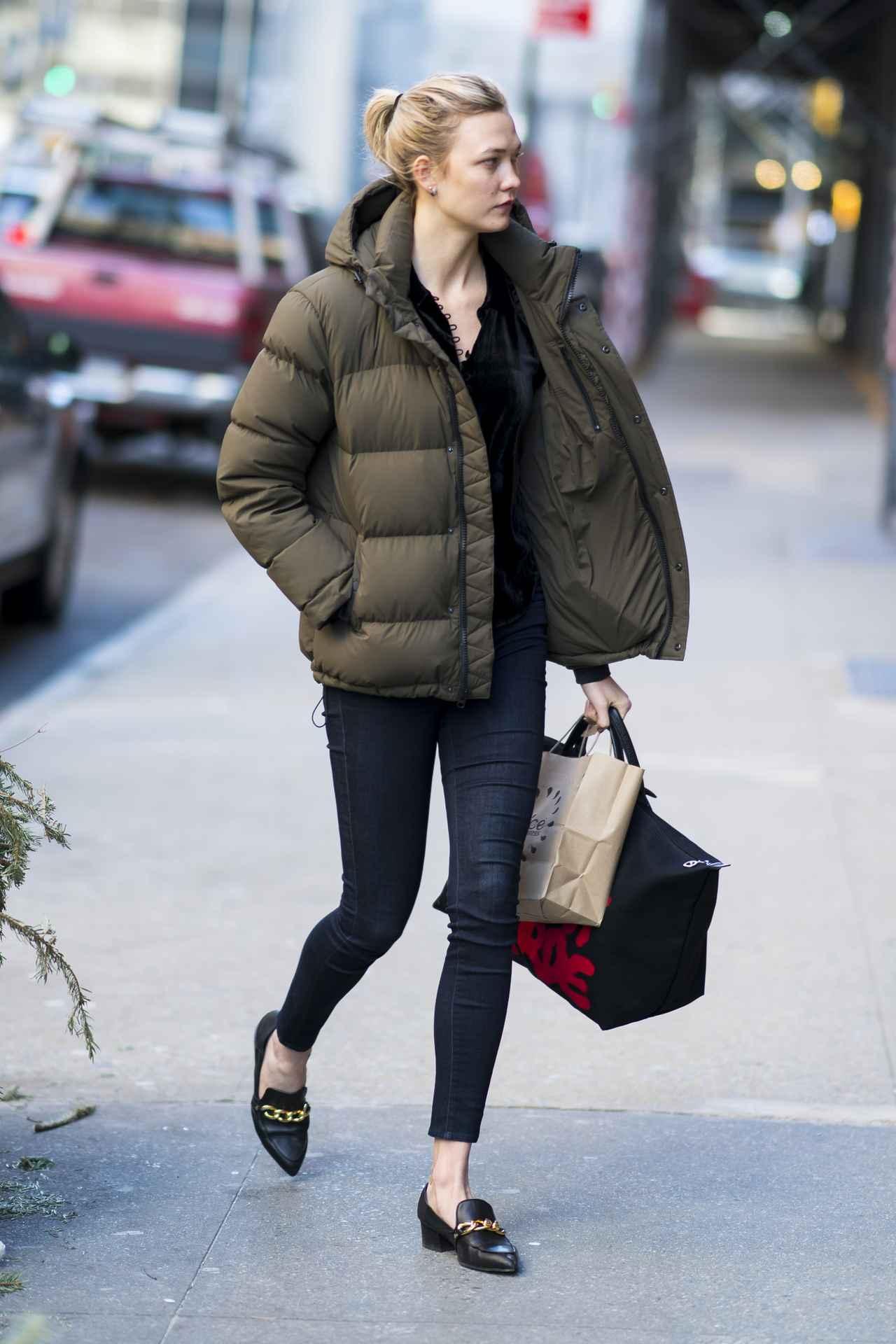 モデルのカーリー・クロスは、シンプルなデニムスタイルにマニッシュなテイストのカーキカラーのダウンジャケットを羽織って。
