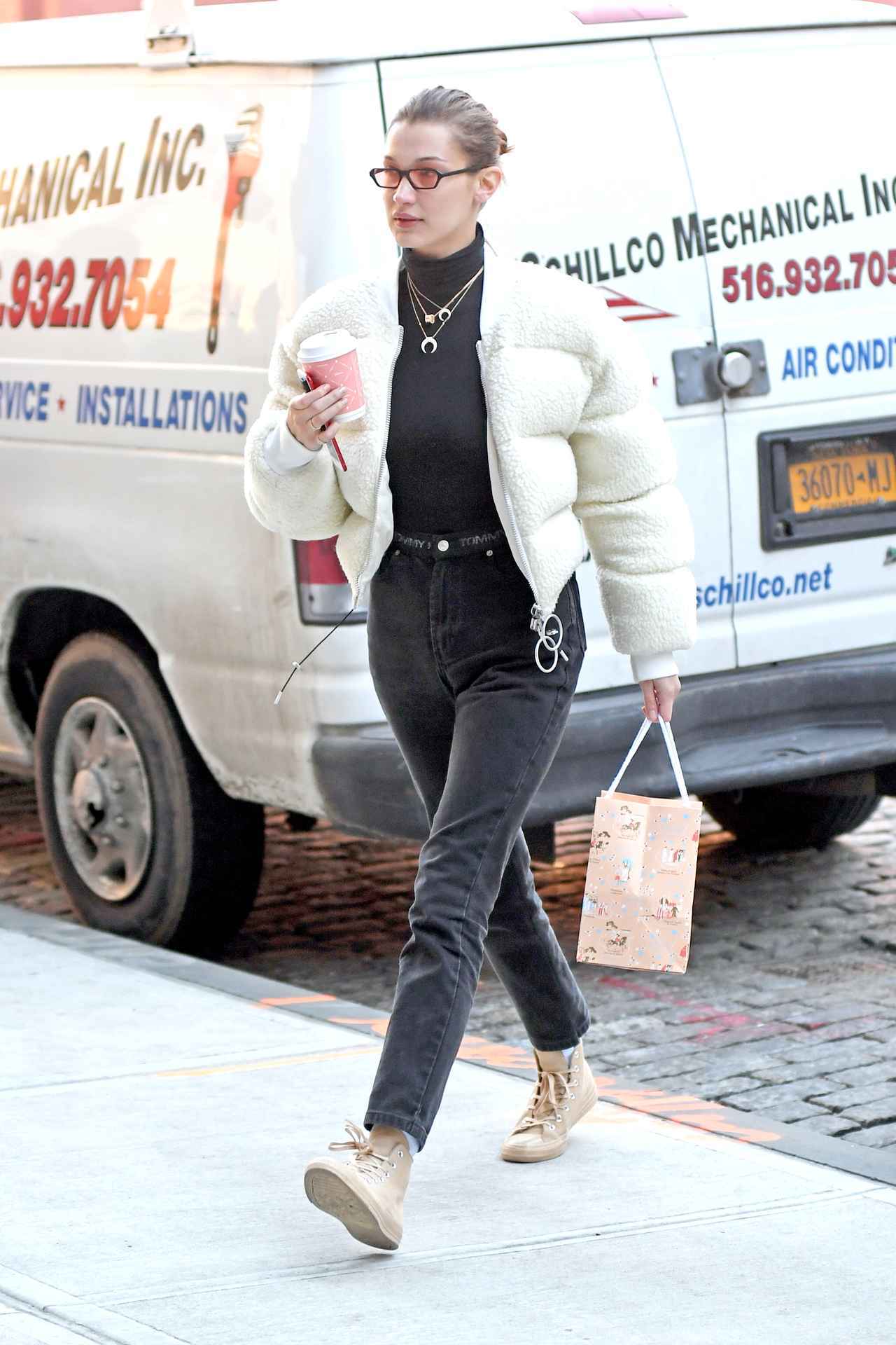 今季人気のホワイトカラーのダウンを愛用するモデルのベラ・ハディッド。膨張して見えやすいホワイトのダウンルックには、タートルネックにネックレスを重ねづけしてアクセントを効かせ引き締めて。