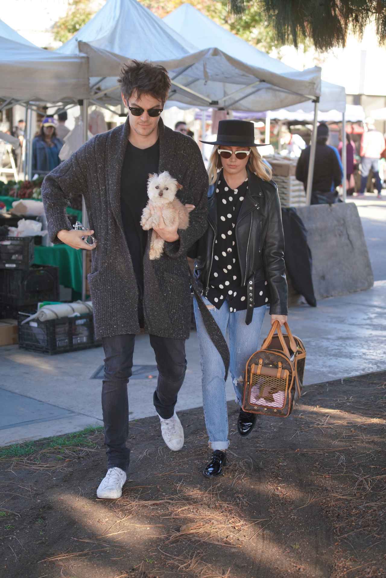 2人の愛犬を抱えたクリストファーはカーデを羽織り、ラフだけどキレイめに仕上げたLAスタイルのブラックコーデでアシュレイとマッチ。
