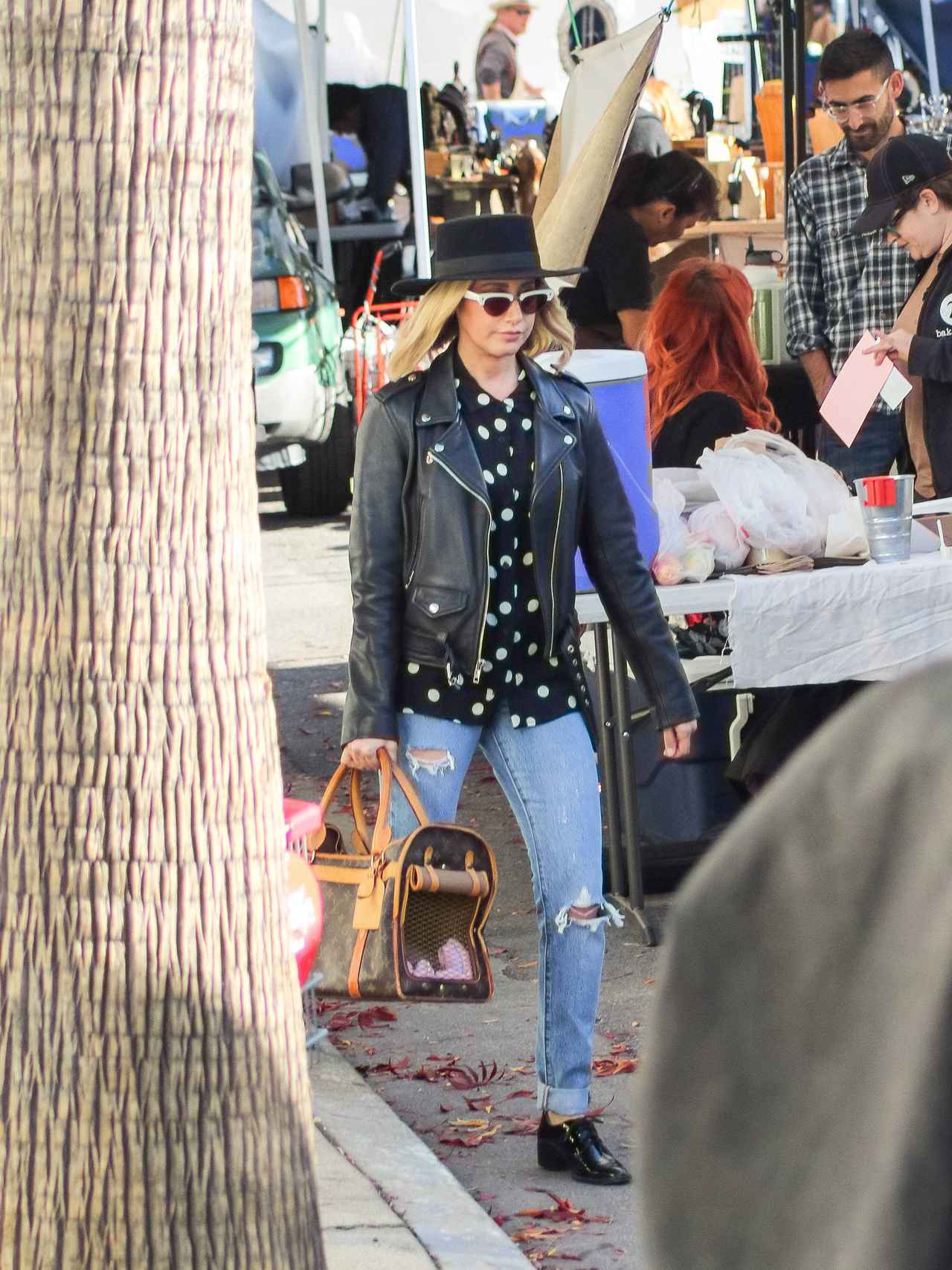 ドットのシャツをインナーに、レザージャケットとレースアップシューズでモードテイストを取り入れたデニムスタイルのアシュレイ・ティスデイル。ホワイトフレームのサングラスで全体をモノトーンに仕上げて。