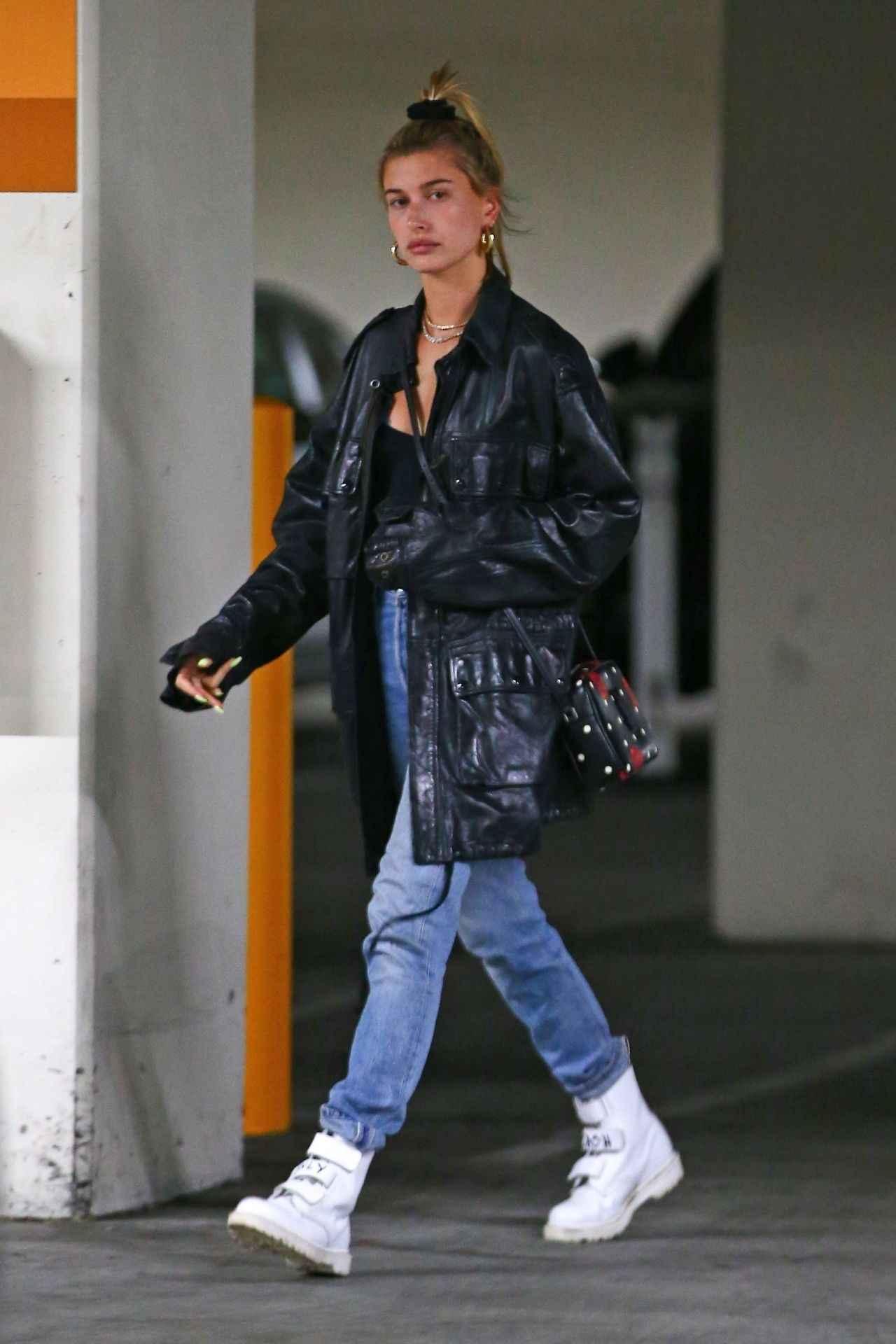 Tommy Hilfiger(トミー ヒルフィガー )のロゴフーディーとダウンジャケットに、Yeezy(イージー)のインディゴブリーチ・デニムを合わせたヒップなスタイルの足元に、ドクターマーチン のベルクロブーツ「コラリア」のホワイトを合わせたヘイリー・ビーバー。