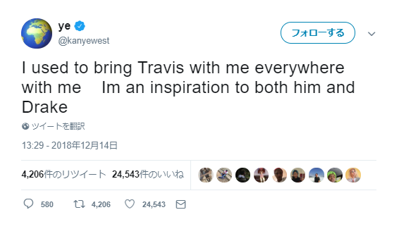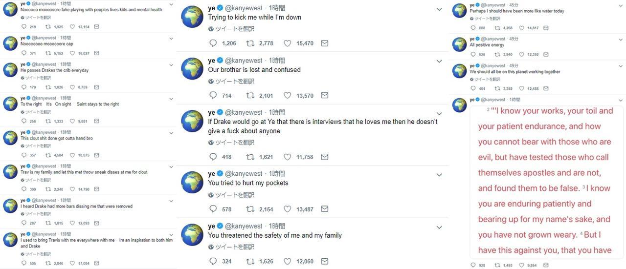 “第3ステージ”に突入した連続ツイートの第一声は、「昔はトラヴィスをどこでも一緒に連れていった。俺は彼とドレイクのインスピレーションだ」というもの。