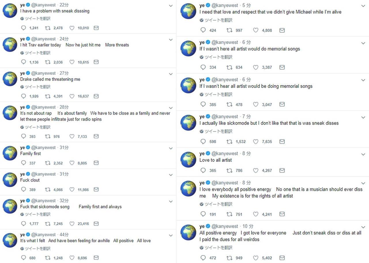 “第1ステージ”でカニエがドレイクから送られてきた1通のメッセージにブチ切れし、“第2ステージ”ではドレイクから脅迫されたと訴えるなどの支離滅裂なツイートを繰り返し、最後に「俺は曲にネガティブなエネルギーを吹き込んだりしない。ポジティブなエネルギーだけだ」と吐き捨て、一度姿を消したのだが、約30分後にツイートを再開。
