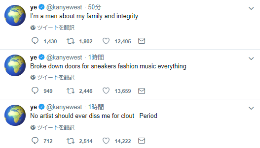 それから約40分後、ツイッターに戻ってきたカニエは、「俺は間違えを犯しました。カルマはあります。完璧な人はいない。この惑星は俺たちを試している」「ポジティブなエナジーだけだ」「すべては愛です」とツイートし、感情に溢れた怒涛のツイート劇を締めくくった。