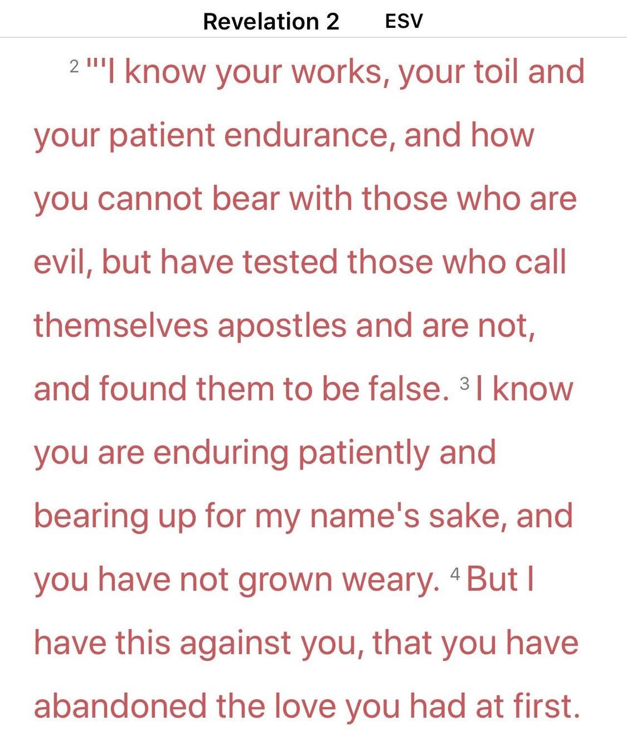 わたしは、あなたのわざと労苦と忍耐とを知っている。また、あなたが、悪い者たちをゆるしておくことができず、使徒と自称してはいるが、その実、使徒でない者たちをためしてみて、にせ者であると見抜いたことも、知っている。あなたは忍耐をし続け、わたしの名のために忍びとおして、弱り果てることがなかった。しかし、あなたに対して責むべきことがある。あなたは初めの愛から離れてしまった。