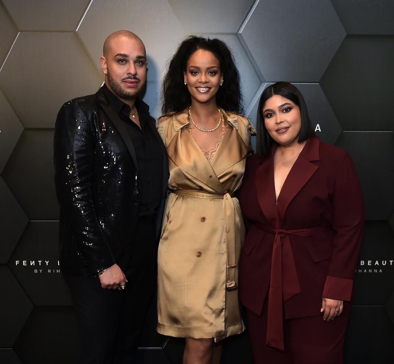 ドバイでのローンチイベントに出席したリアーナとプリシラ(写真右)。左は同じくFenty Beauty公認メイクアップアーティストのヘクター・エスピナール。