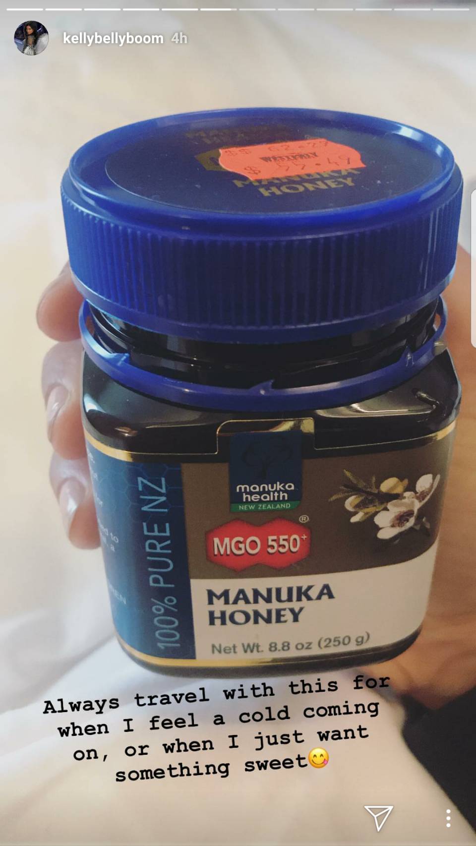 そんな彼女が風邪の引きはじめや甘いものを食べたくなった時に食べるものを自身のインスタグラムで公開。その食べ物とは、マヌカハニー。移動が多いケリーは、このマヌカハニーを持って旅行をしているそう。