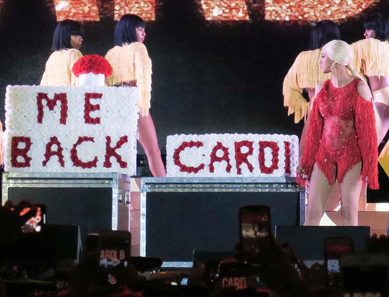 カーディの衣装に合わせたホワイト×レッドで「TAKE ME BACK CARDI(カーディ、ヨリを戻して)」と書かれたフラワーアレンジメントが突然ステージに現れると、オフセットがサプライズ登場。