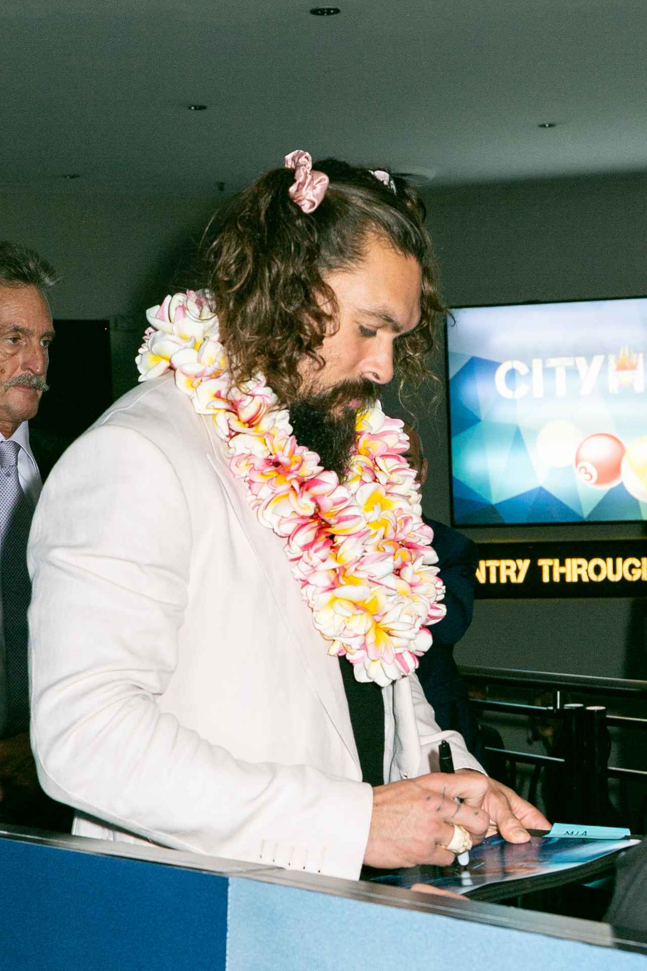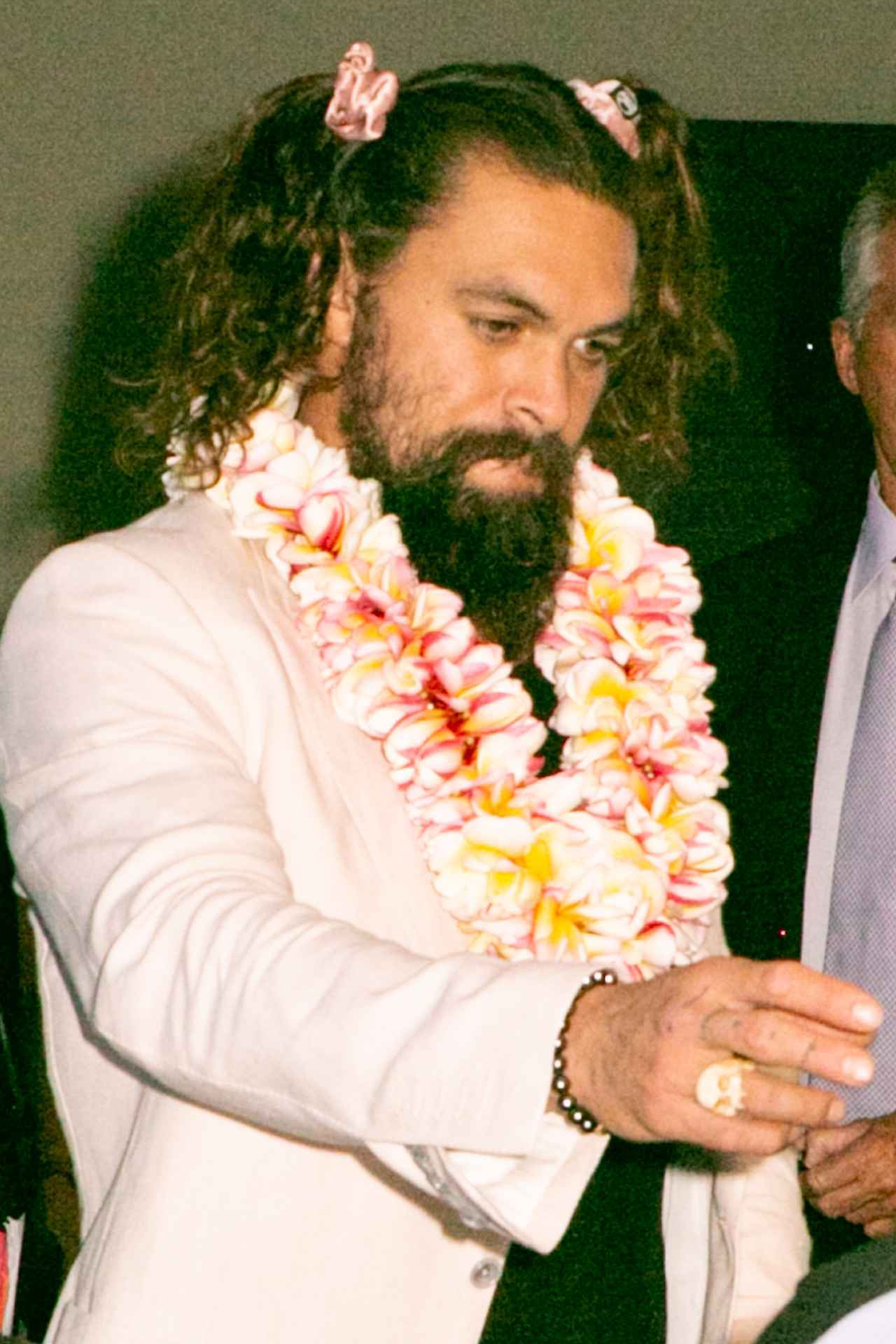この日、 オーストラリアのシドニーで開催された『アクアマン』のプレミアに出席したジェイソンは、何を思ったのか、プレミア後に自慢のロングヘアをピンクのシュシュでふたつ結びに。