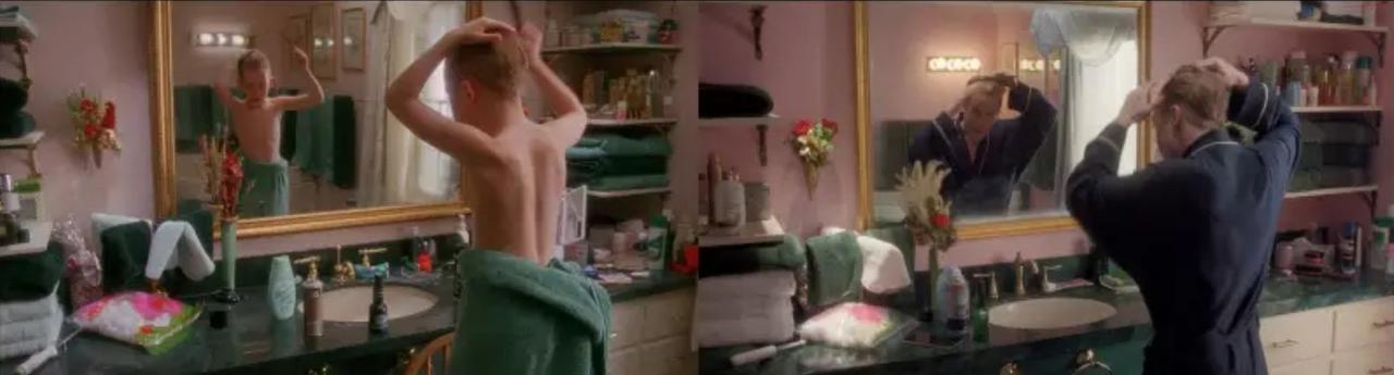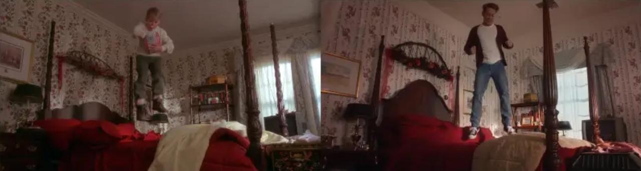 オリジナル版の映像とぴったりと一致する再現度も素晴らしいが、少年時代のようにベッドの上で飛び跳ねてみたら、腰を痛めてしまう…といった中年ケビンの不甲斐ない姿も視聴者たちの笑いを誘っている。