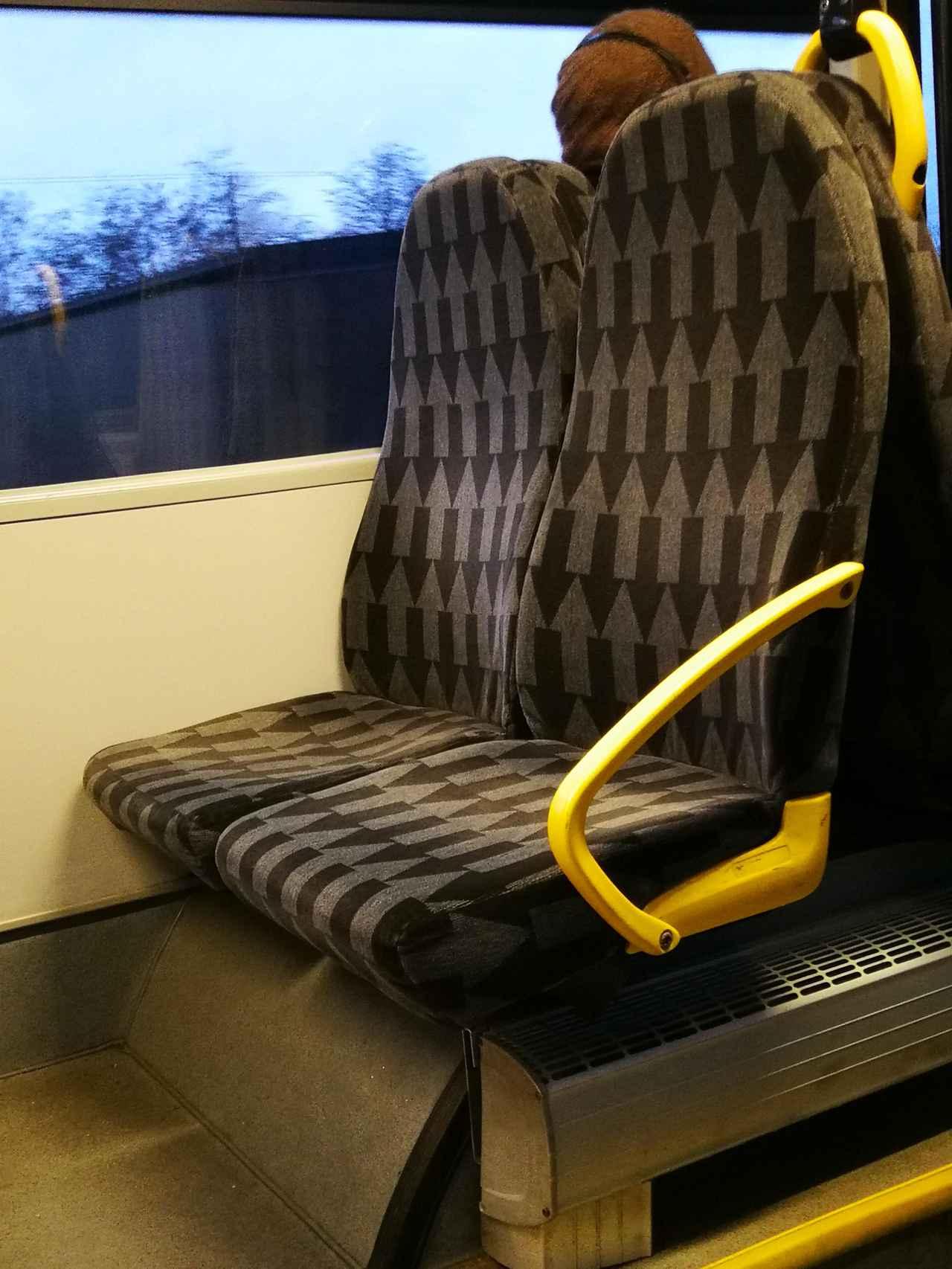 ある電車の座席のデザインとして用いられた矢印のマークが話題を呼んでいる。(フロントロウ編集部)