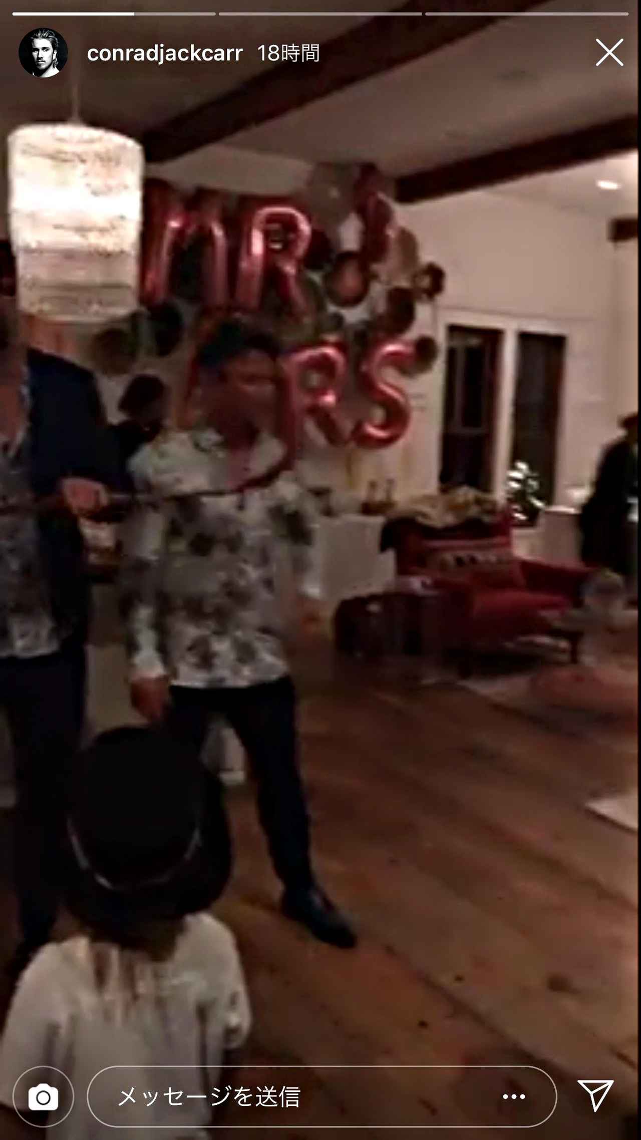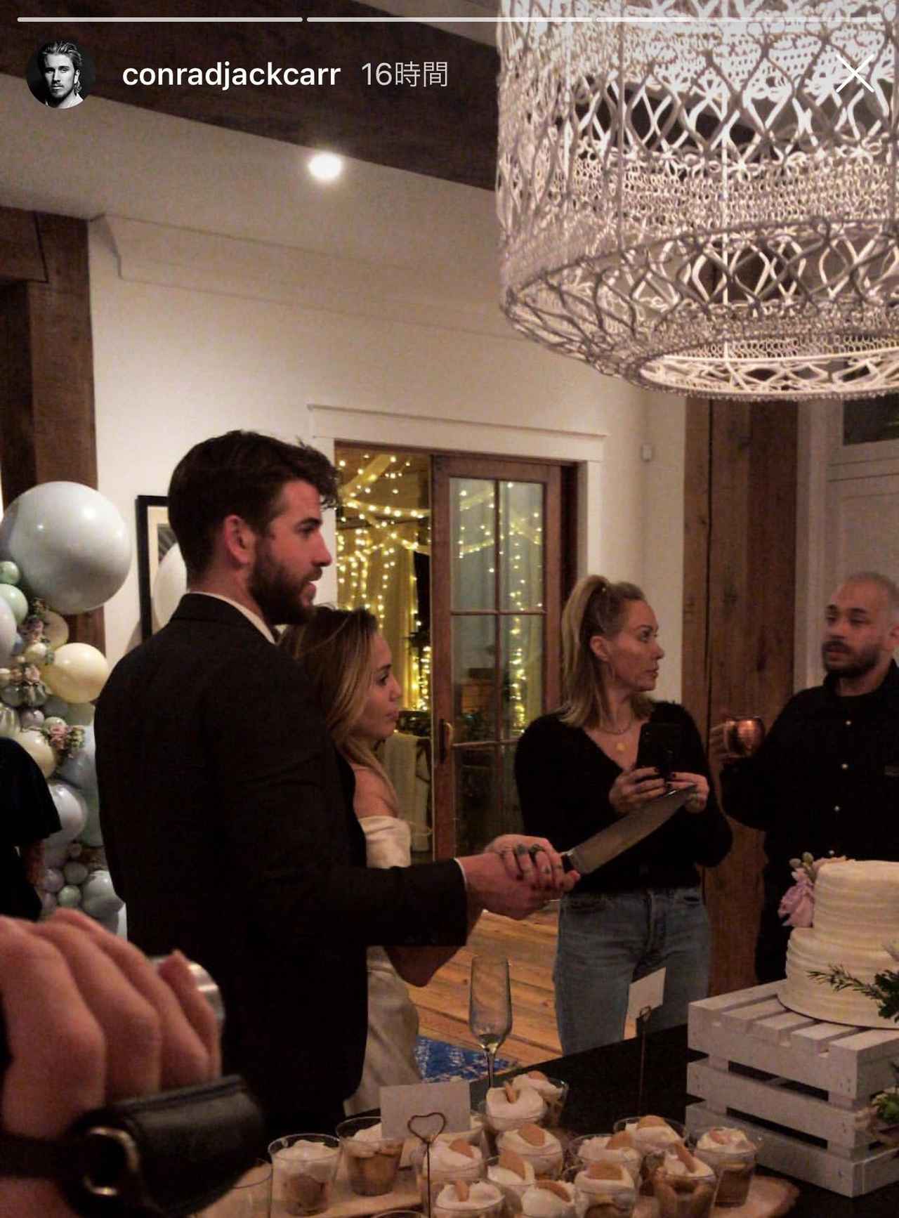 マイリー・サイラスとリアム・ヘムズワースの友人であるサーファーのコンラッド・カーのインスタグラム・ストーリーに公開された投稿では、夫婦をあらわす「Mr. and Mrs.」というデコレーションが飾られた部屋にマイリーとリアム両方の家族が集まっており、白いドレスを着たマイリーがリアムと一緒にナイフを持ちケーキカットをしているように見える写真まである。