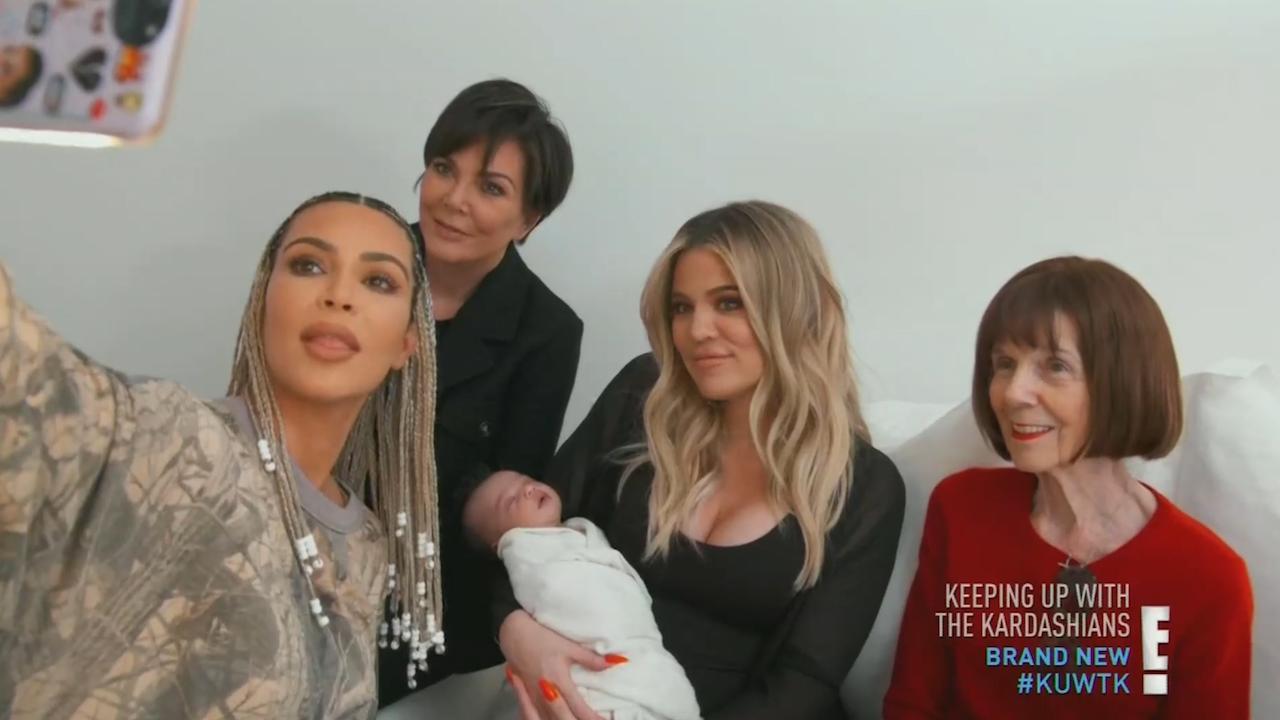 キムやクロエの祖母(右)から新しく誕生したベビーまで、カーダシアン家4世代が勢ぞろい。
